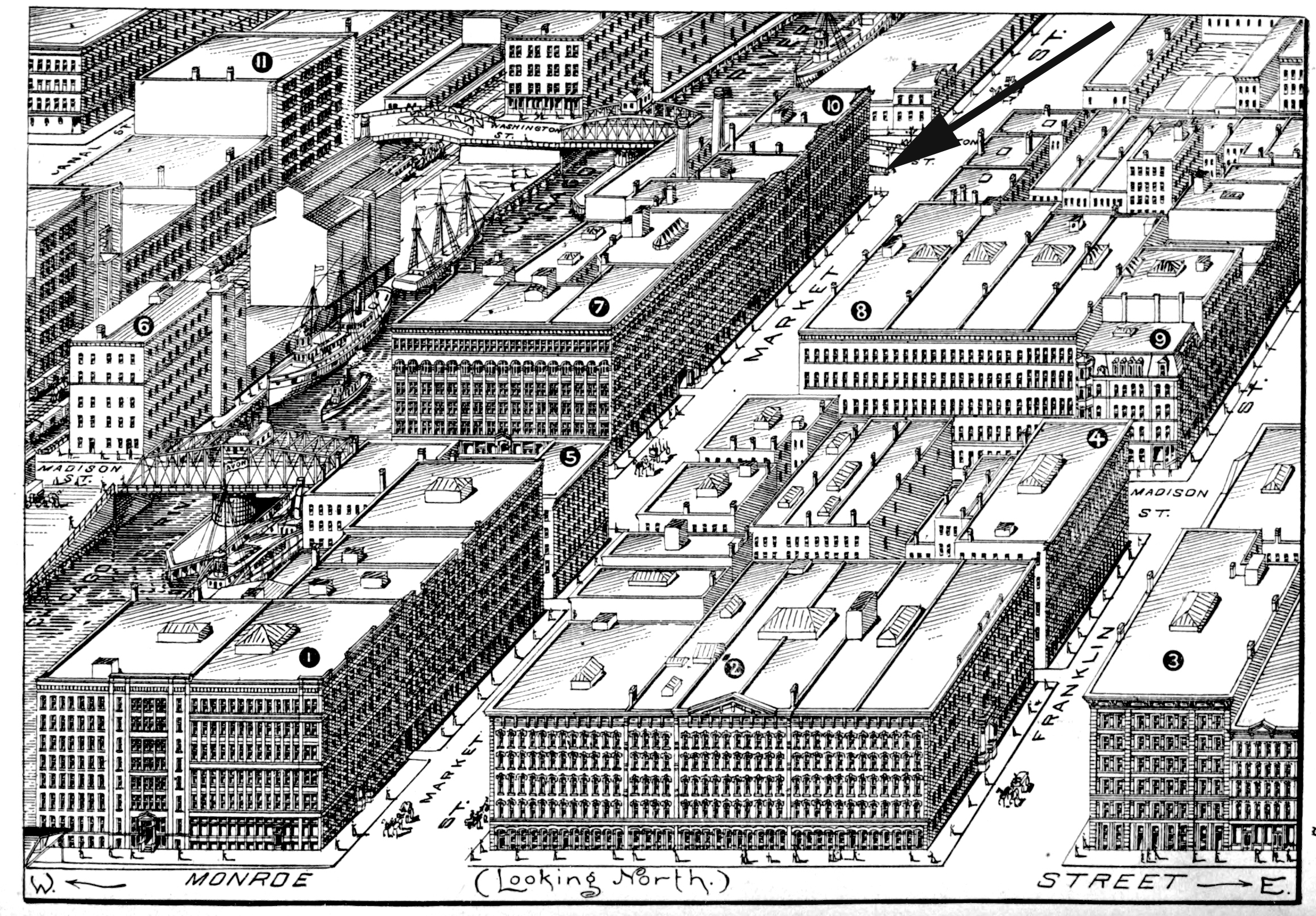 - 1869 Sanborn map shows that before the Great Fire, the Southwest Corner of Washington and Market Streets was a dock yard occupied only with wooden frame buildings and so there was virtually no debris to clean up. Stone foundations were laid just three days after the fire. Note that at this time the Washington Street Tunnel was used.