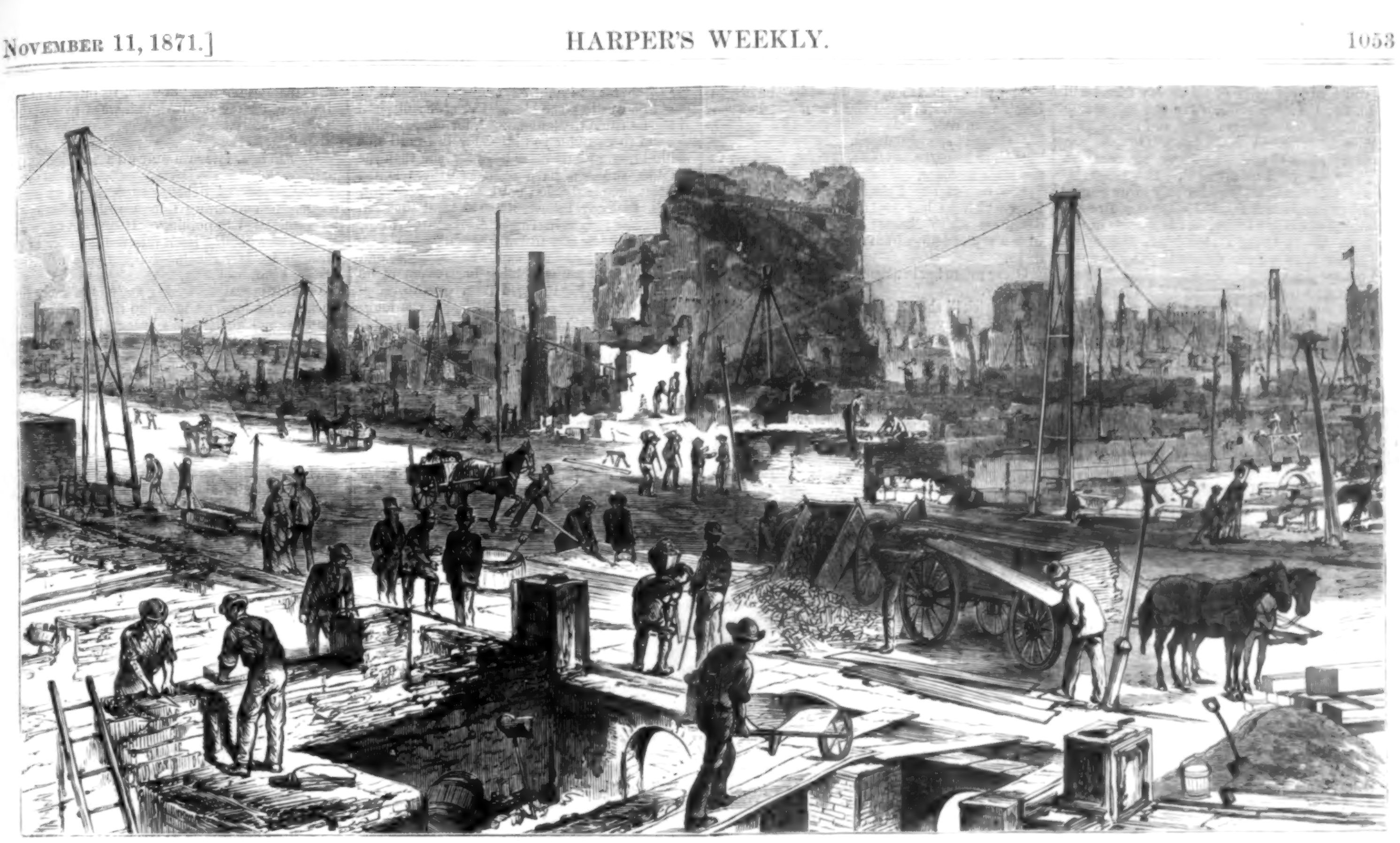 Our sketch on page 1053 illustrates the energy of the Chicago people in meeting the heavy disaster which has befallen their city. They have gone to work with undaunted hearts, and the determination not only to obliterate within the next five years every trace of the fire, but to make their city still more magnificent and prosperous than it was before.