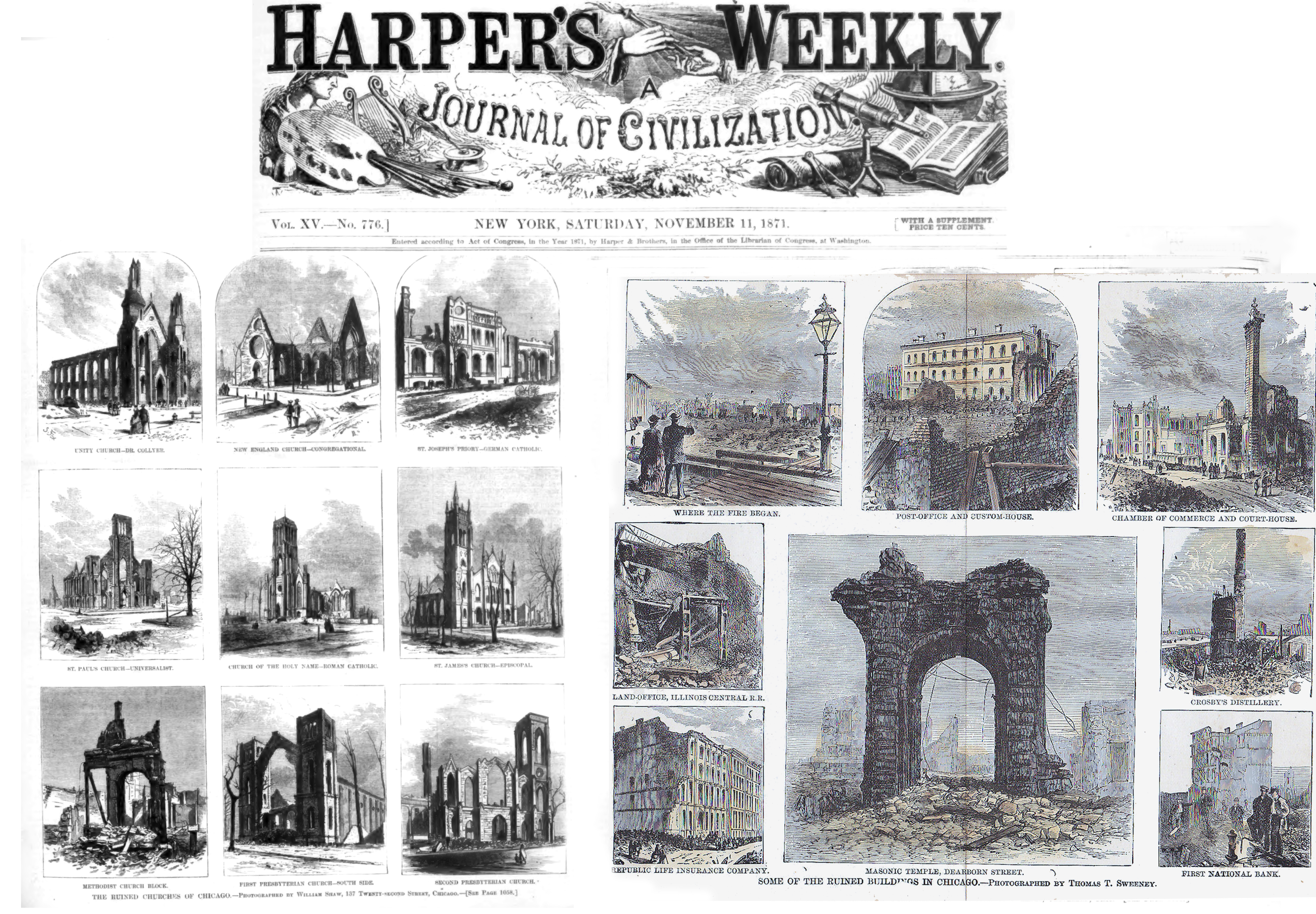 Chicago was noted among American cities for the number and elegance of its churches. The great majority of these edifices were within the burned districts, and, as a glance at our first page this week will show, little now remains of them but a few broken walls, towers, and arches to show what they must have been before the conflagration, and also to indicate what they will be again when Chicago shall have been rebuilt. Our illustrations are from photographs courteously furnished by Mr. Thomas T. Shaw, of Chicago, who was indefatigable in taking views both during and since the fire.