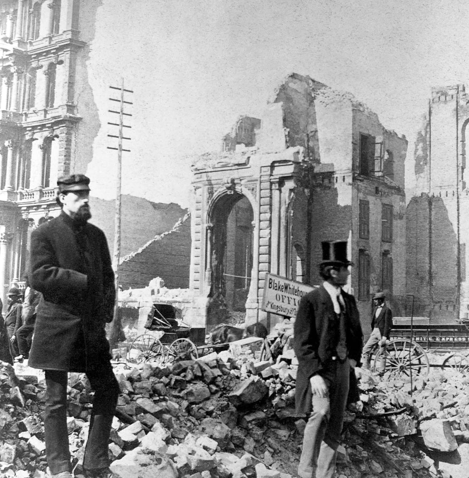 - The ruins of the courthouse and City Hall (in background) in the days after the 1871 Chicago Fire. There are workers walking through the wreckage in the area of the devastation of the courthouse. The long exposures of the era render them ghostly.
