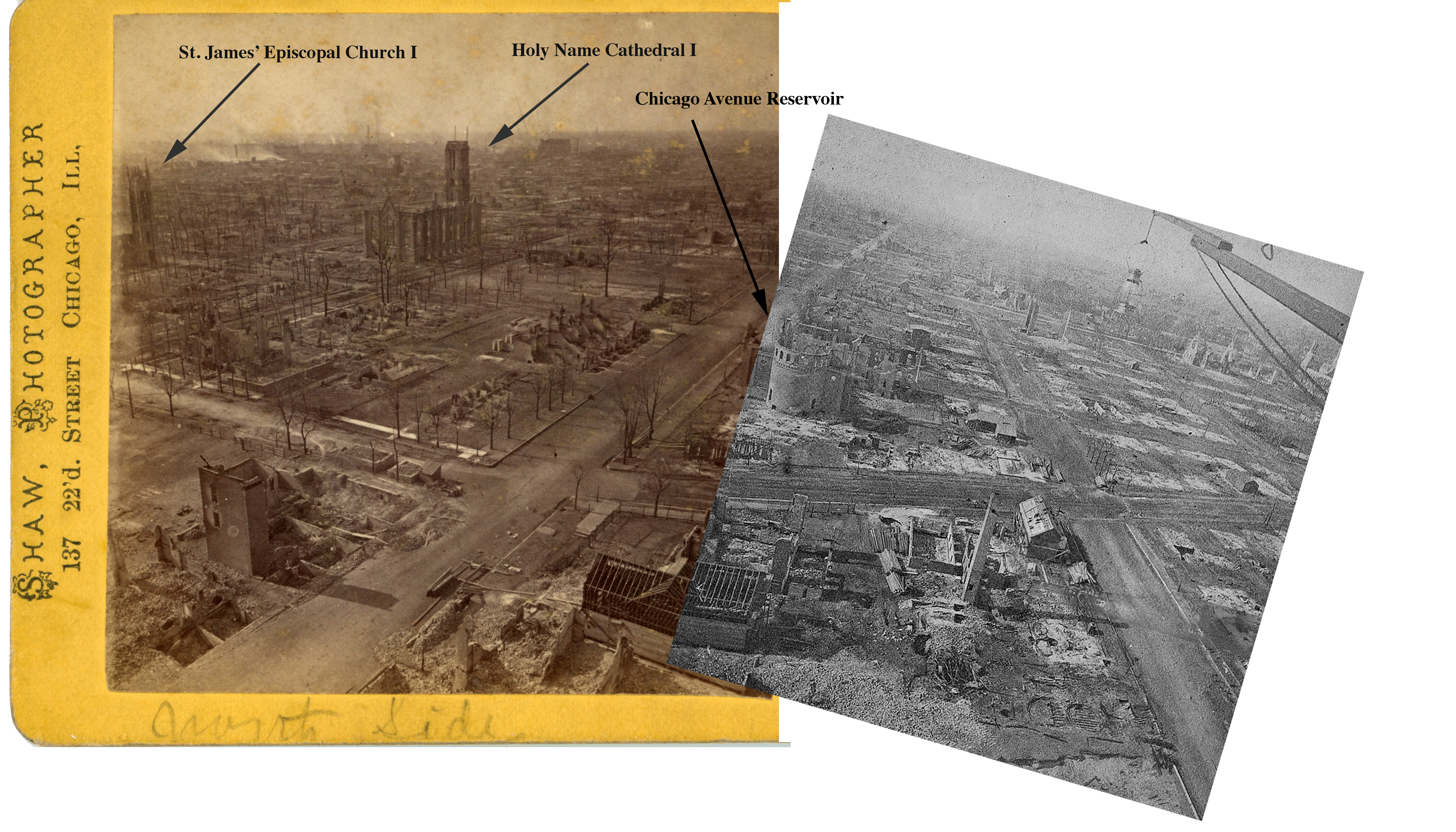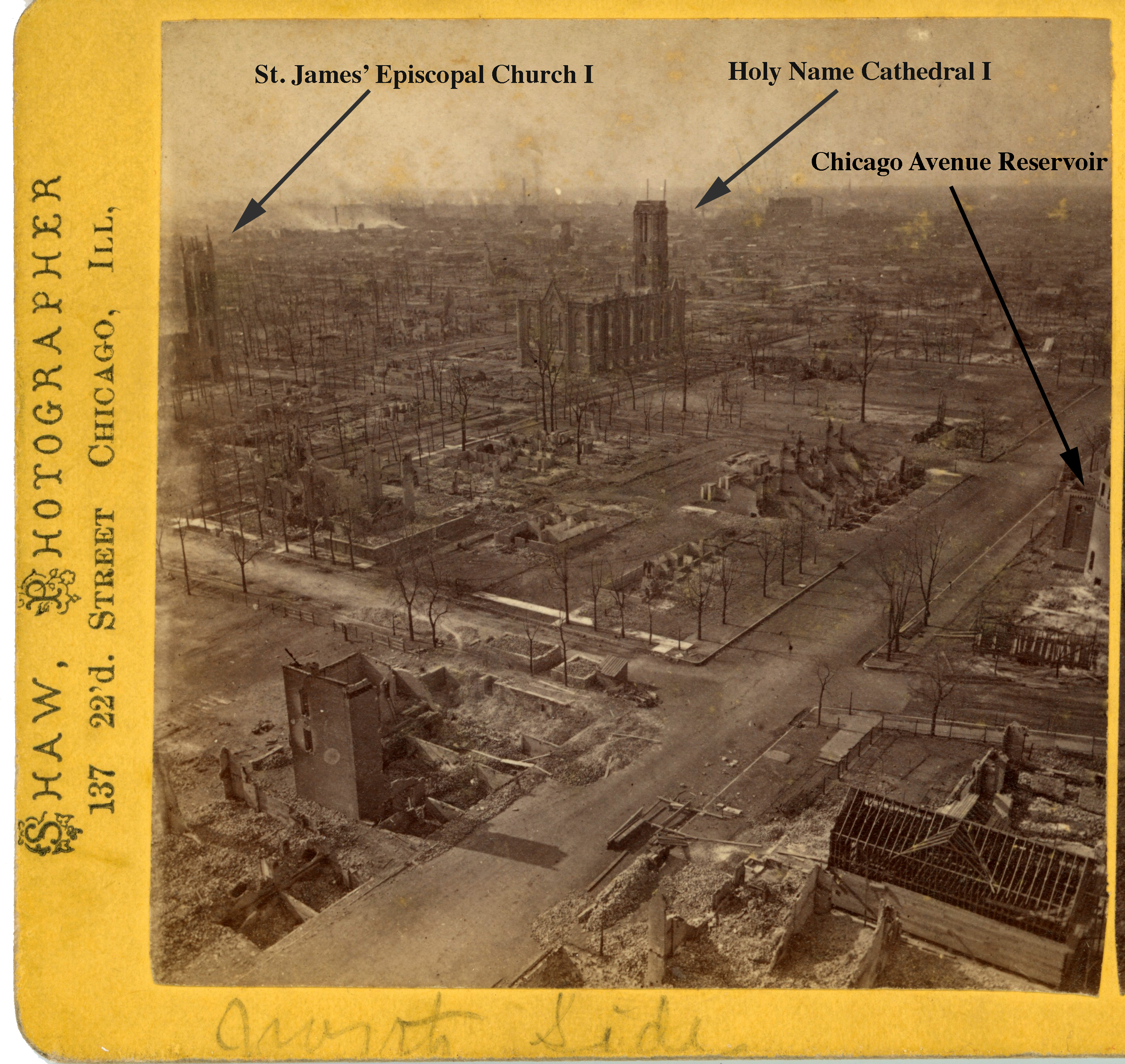 St. James’ Episcopal Church and the Holy Name Cathedral can be seen. The tower of St. James’ church remains today as the rest of the church was rebuilt around it. The entire Holy Name Cathedral was rebuilt. The Chicago Avenue Reservoir can also be seen.