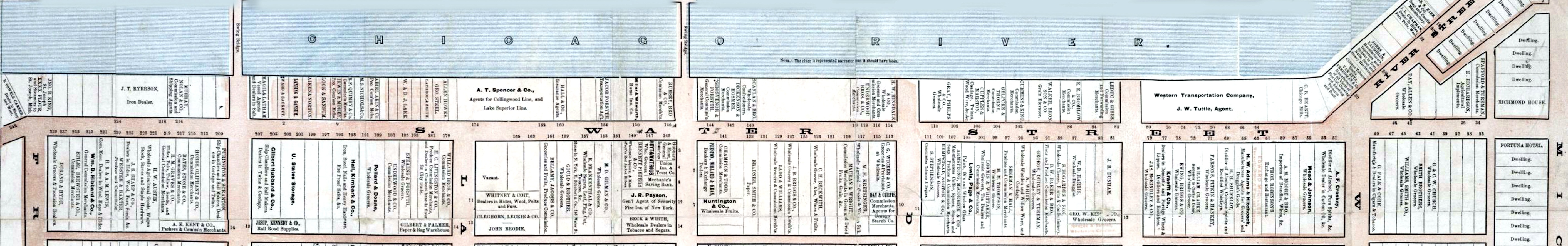 - In 1861 the buildings on the south side of the street were much the same as they are today, from the outside appearance at least. On the north side, on the river, it was irregularly built. The Chicago Board of Trade was between Wells and La Salle, with a 150 foot frontage and 75 foot depth, an entrance at both ends of the building. At the northeast corner of Wells and the street was the Latham salt yard.