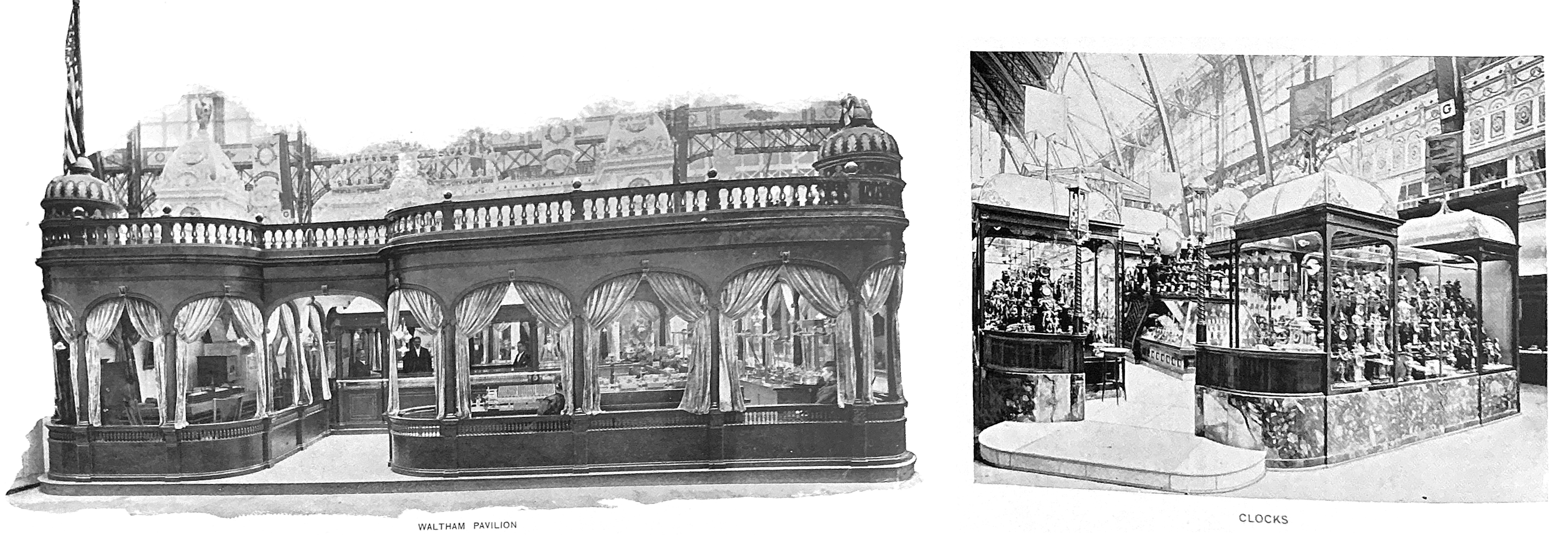 The exhibits proper of the Waltham Watch company consist of their various articles of manufacture, and except for a model of their works were not specially prepared for the occasion. For the most part it is restricted to watch movements, of which there are more than 2,000 varieties, the company having ceased to manufacture, as in former years, the completed timepiece. There is, however, a handsome piece of mechanism in the form of a watch made of quartz and agate, except for the wheels, which are made of the usual watch materials. It is valued at $1,700, and can be illumined by electricity so as to reveal the workings of every part. Along two sides of the pavilion is a range of machinery in motion, demonstrating the advancement made in the methods of watch manufacture from the days of the Centennial Exhibition to the present time. The company claim to be the originators of what is known as the American system of watch manufacture, whereby machinery is used for the work .which was formerly done by hand. To illustrate the progress in this direction, the machines here in operation are similar in construction, but run with a minimum of operatives. There was formerly, for instance, one operator for each machine, where now is a combination of four machines in charge of one person, who can take care of six of these brings combinations, doing the work of twenty-four persons, and in many respects doing it better. Another machine is of different plan, and instead of handing the work from one to the other, turns round and the completed work to the operator, then is re-filled and starts on its round again. In all these machines it has been demonstrated that they can perform the work of that part of a watch which requires the utmost delicacy of touch, and which it was thought until recently could only be done by hand.
