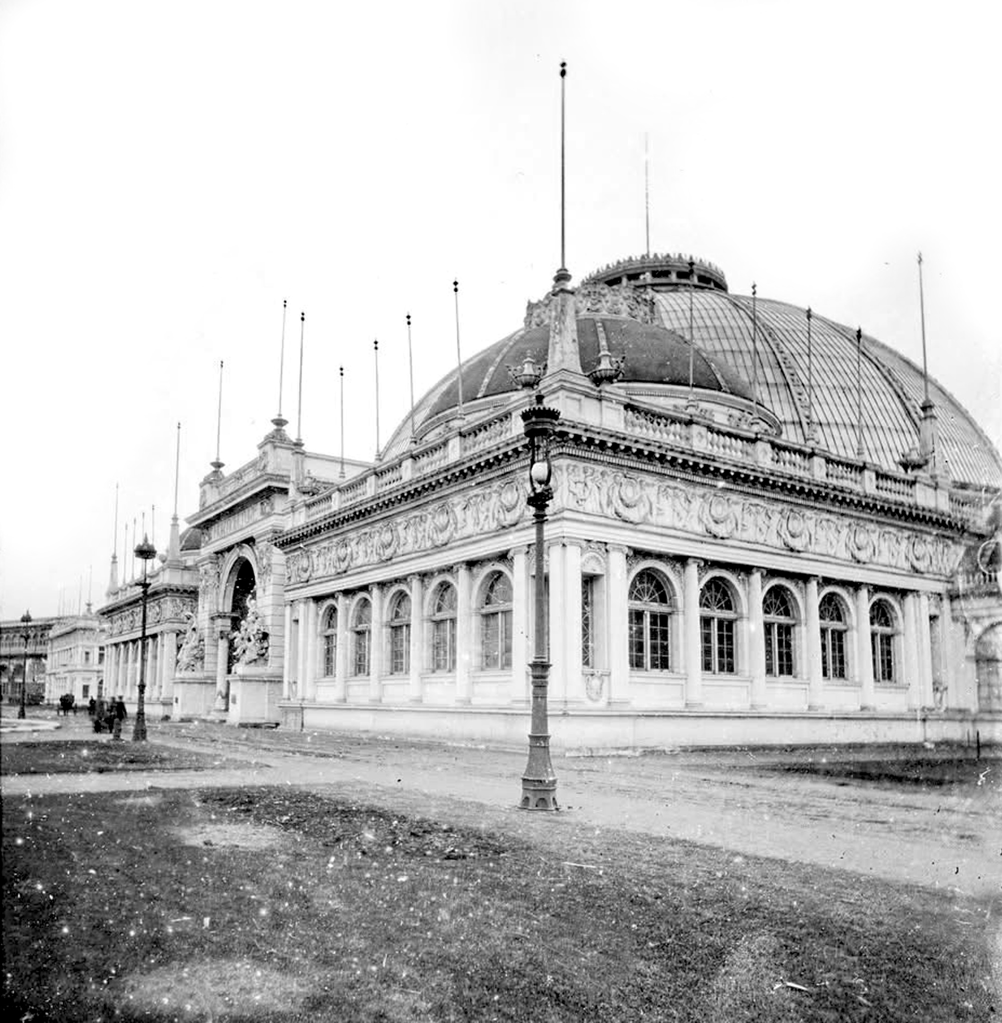 MAIN STRUCTURE AND DOME ON THE HORTICULTURE BUILDING.—The admirable features of the Horticulture Building’s architecture to be considered were lost to the eye of many for the double reason that its chief attractions were near the center and were to an extent lost in a view of the structure as a whole, and that the space between the Horticulture Building and the West Lagoon was but the width of a roadway and prevented the observer from going a sufficient distance away from the structure to perceive its idea in its entirely. Practically, the only proper point of appreciative observation o the Horticulture Building was on the Wooded Island, and from this point, because of the intervening shrubbery, very few photographs were taken. In the accompanying illustration one of these views is reproduced and shows the vast dome of the edifice with all the architectural effects supporting it. They appear, certainly, to advantage under present circumstances. The great symmetry of the whole appeals to the eye even of those untrained to the criticism of architectural effects. Approaching its main portal only by the parallel highway, many thousands who entered the great structure failed to realize the beauty or its facade. Here just what that beauty was is indicated. Taken alone. with the connecting curtains and the great end structures swept away, the Horticulture Building might have become even more noted than it did as one o the architectural marvels of the Fair and one fully up to the standard of the great works behind it. It was a pleasant thing to look upon.