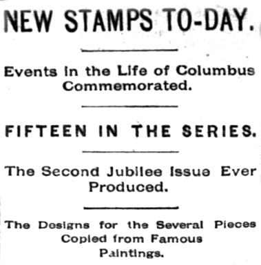 Five new envelope stamps will also be insued of values 1, 2, 4, 5, and 10 cents. The general design on these will consist of profiles of Columbus and Liberty above the figure of an eagle with outstretched wings and surmounted by a shield similar to the one used in the arms of the United States.