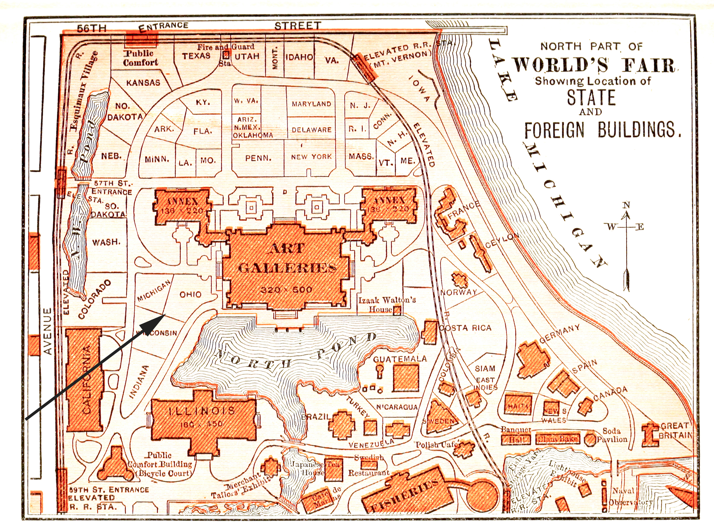 Of the $150,000 appropriated by the legislature of Ohio, some $35,000 was used for the state building, which is of colonial pattern, its main entrance on the east, in the form of a semi-circular colonnaded porch, extending to the upper story. The wood work and tiling are all of native materials, the red tiles used for the roof being a contribution from New Philadelphia. Windows of stained glass bear the names of such men as Chase, Grant, Sheridan, and Sherman, while near the main entrance is a monument surmounted by a graceful figure, symbolic of Ohio, below which upon sub-pedestal are statues of those whom state and nation love to honor. Opening from the main lobby are parlors and committee rooms, and in the centre is a hall decorated with buckeyes molded in stucco, the coat-of-arms worked in stained glass appearing above its spacious fireplace. Back of the hall is an open court, one of the enclosing wings containing the quarters of the bureau of information, and another a parlor for men, with writing and smoking rooms. On the second floor of the two wings are the assembly hall and a chamber for press correspondents.