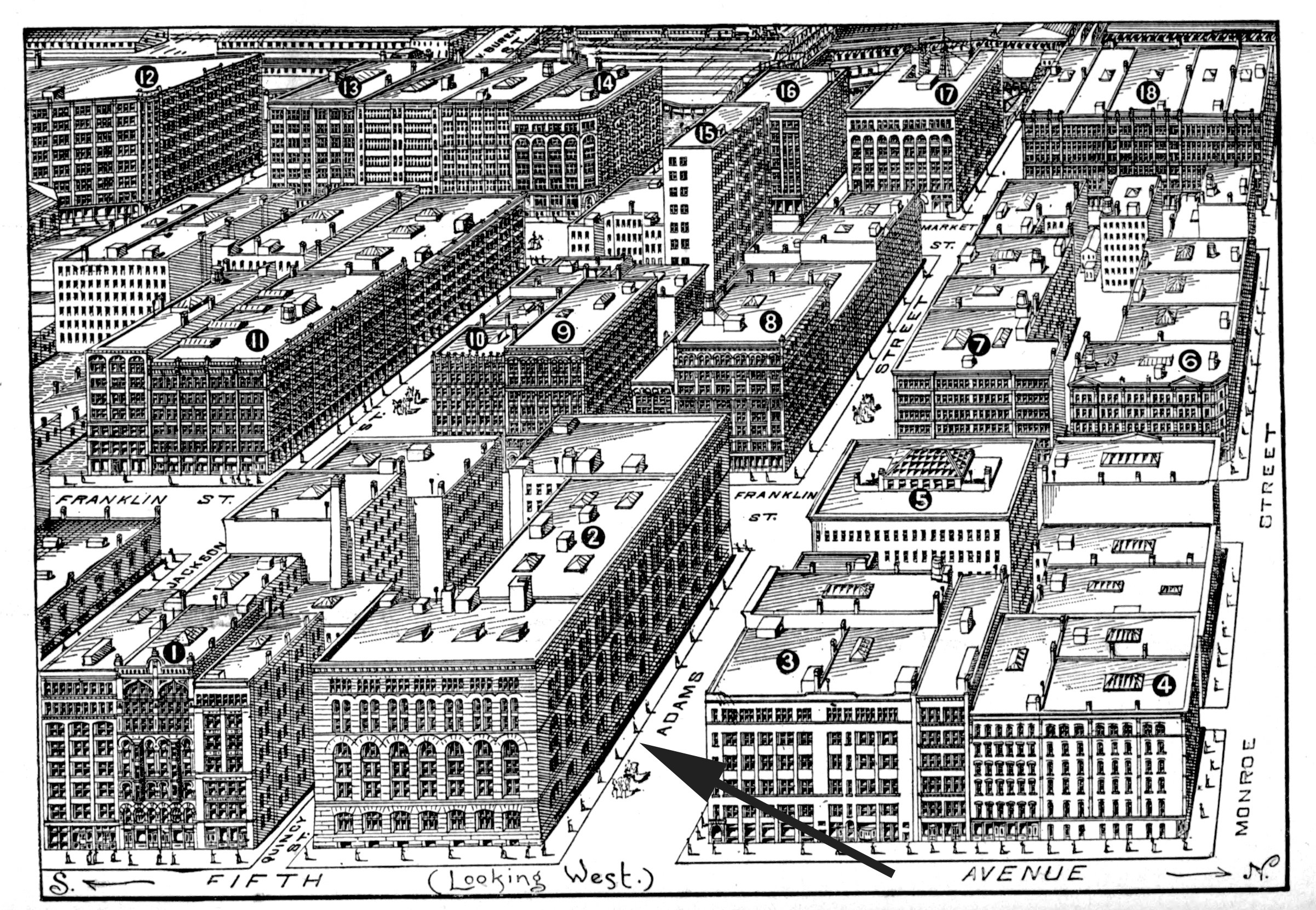 It was learned yesterday from a contractor who is in a position to know that in about two weeks from date work will begin on one of the largest and finest buildings of the kind that have ever been planned in this city or in any other in the country. It is the intention of Marshall Field to put up a ten-story fire-proof warehouse which shall cover the whole of the block owned by him bounded by Adams, Quincy, Fifth avenue, and Franklin. This is a small block as compared with most of those of the South Side, but it is so large that the building which shall cover the whole of it will be an enormous one. None other, indeed, would do for a wholesale trade of such dimensions as that of Field’s. It is understood that the reason why the present one is to be abandoned is not only because there is not room enough there, but also because the ground does not belong to Mr. Field. It is made up of many lots which were leased by Field & Leiter when they built there after the fire, and the lease will expire in about three and a half years. Part of the ground—the larger part—is owned by L. C. P. Freer, some belongs to the estate of Dr. Foster, and part of it to the Peacock estate. It may not be easy to get a new lease on satisfactory terms, and then, too, there is not ground enough. Besides which; the corner of Madison and Market might pay better were it used for something beside a wholesale store. The plans for the immense warehouse have, it is understood, been prepared by S. S. Beaman, and it is the certainty that the work of excavating will begin so soon which has put the contractors on the alert.
