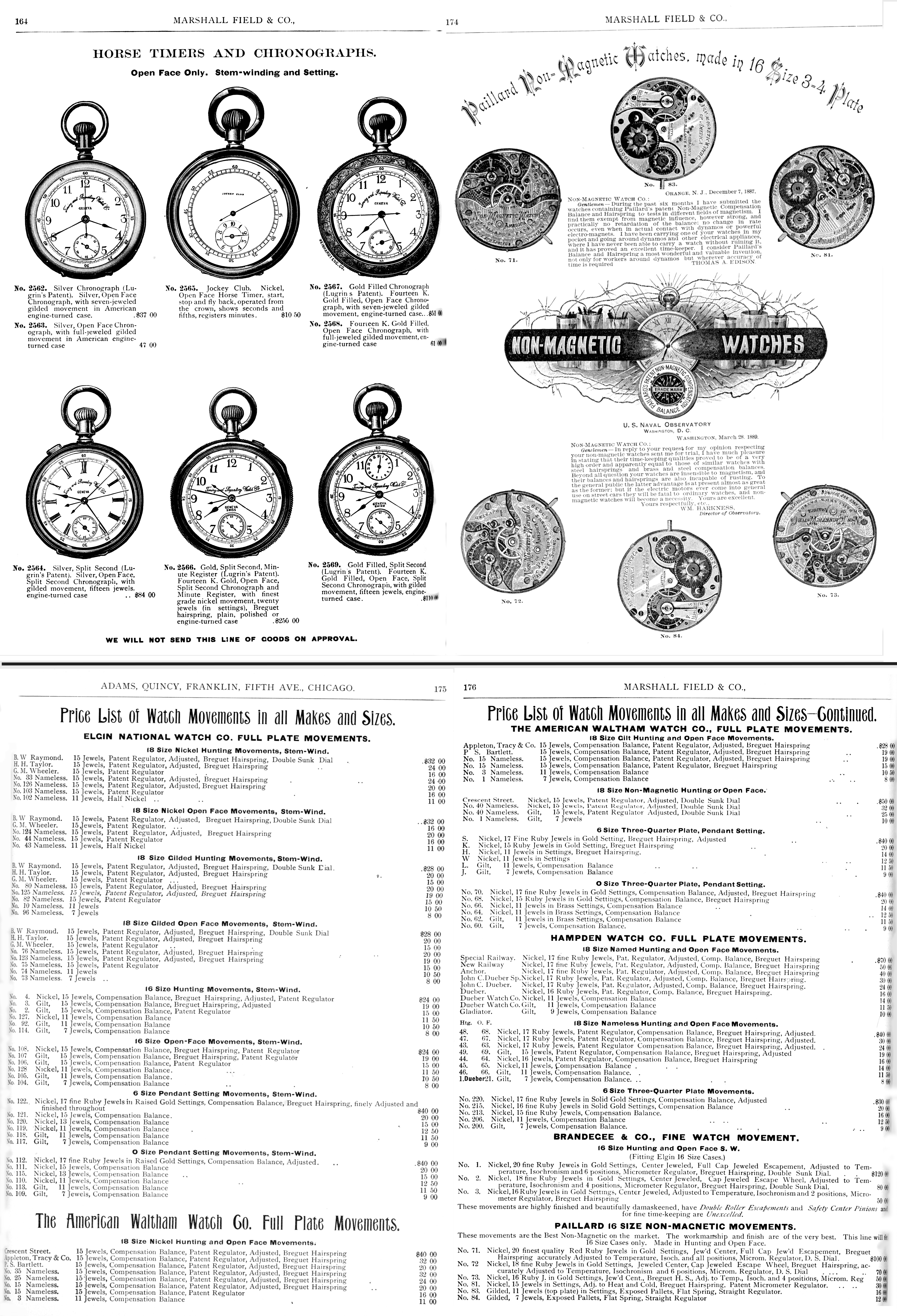 - Before 1908 Marshall Field & Co. sold a high quality range of pocket watches. These watches/movements were manufactured by companies such as Paillard’s Non Magnetic Watch Co., Waltham Companies, Hampden and Brandegee & Co. as reflected above in the 1894 Marshall Field Wholesale Jewelry Catalog. Customers often bought movements and cases separately.