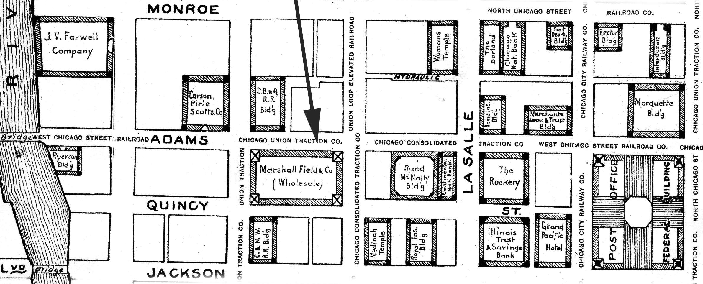 Field Marshall (Marshall Field, Lorenzo G. Woodhouse, Harlow N. Higinbotham, Joseph N. Field and John G. McWilliams) dry goods, wholesale Adams, Quincy, Franklin and 5th av. retail State ne. cor. Washington