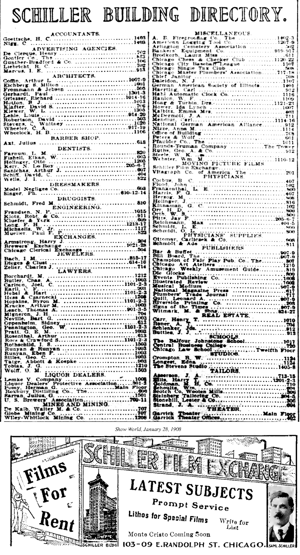 Schiller Theater, Randolph Street Theater (1897), Dearborn (1898) and Garrick Theater (1903)