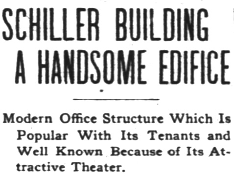In addition to Its 215 offices the Schiller contains a most commodious and beautiful theater on the ground floor, and Schiller hall in the twelfth story, the latter seating 250 people and having one of the best floors for dancing to be found in the city. The building is equipped with four fast servIce elevators, is sixteen stories in height, and is of the best, most modern, and strongest fireproof construction.