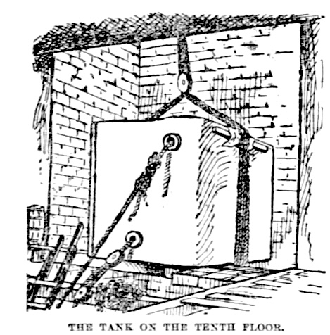 - There were four men on the tenth floor handling the tank when the accident occurred. I was so excited yesterday that I thought it best to say nothing about them. They raised the tank to the tenth floor and pulled it on the steel girder of that section of the passage to sustain it until they could carry the upper block from the eleventh to the fifteenth floor, and thus get a new pull. Then they tried to swing the tank off the girder. Crowbars were necessary to move it. In some way, either by a jolt from the tank or by prying with bars, they dislocated the tiling of the tenth floor. The tenth floor loosened, the rest is explained.