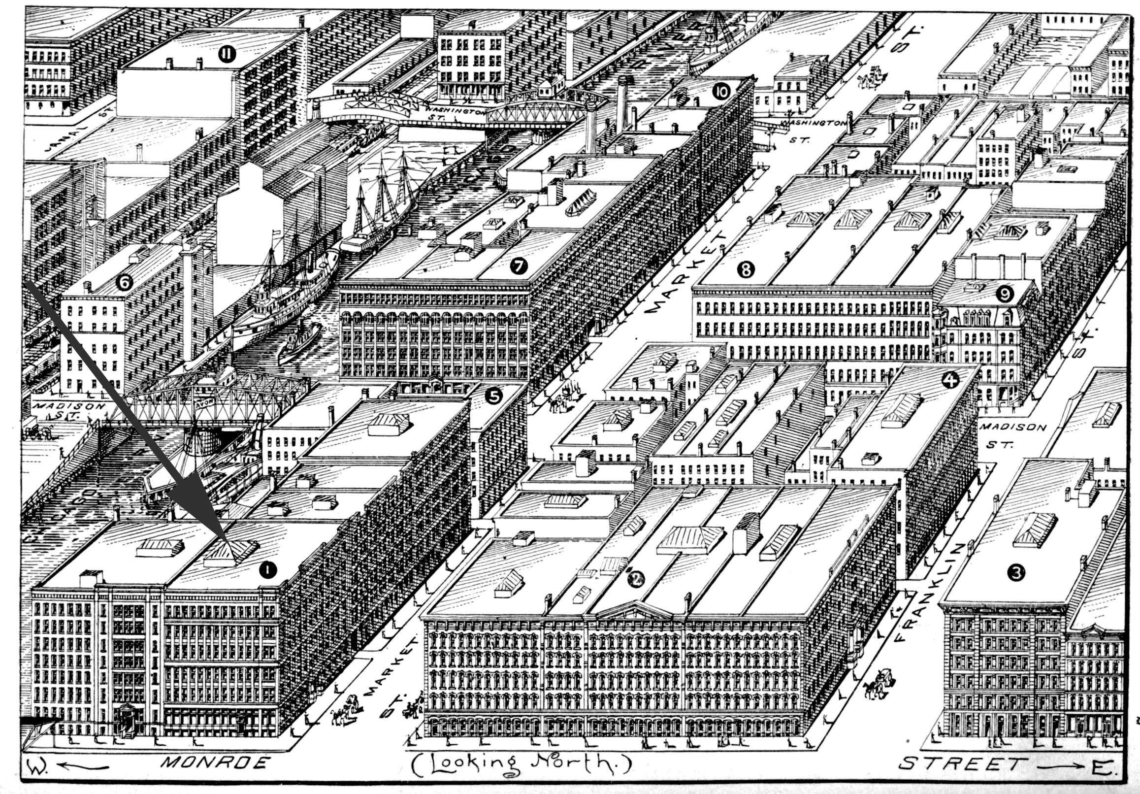 At the northwest corner of Market and Monroe streets, was an old-style 6-story structure, erected in 1883, 95 feet high, with 3 freight elevators. Its exterior is of brick and iron, and its great area may be understood by the statement that it has a frontage of 280 feet on Monroe and 100 on Market Street. It was partly occupied by the well-known wholesale clothing firm of Kohn Brothers, and partly as a warehouse. John M. Van Osdel was the architect. His records show that piles were used. A seventh story was added later. lt was later known as the Selz building.