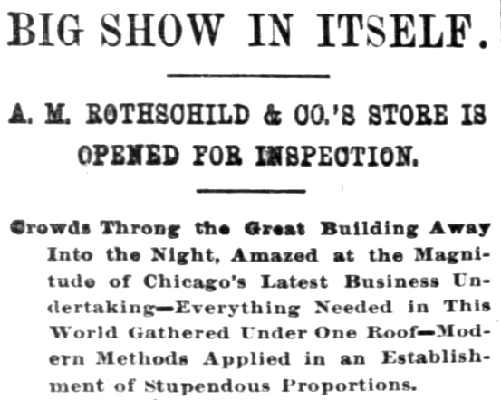 A. M. Rothschild Co., who have built a vast department store at State and Van Buren streets, have learned something about a Chicago crowd they did not know before. They advertised an opening for last night at which souvenirs were to be given the store opened for inspection. Nothing was to be sold. The opening was to begin at 6 o’clock and end at 8.