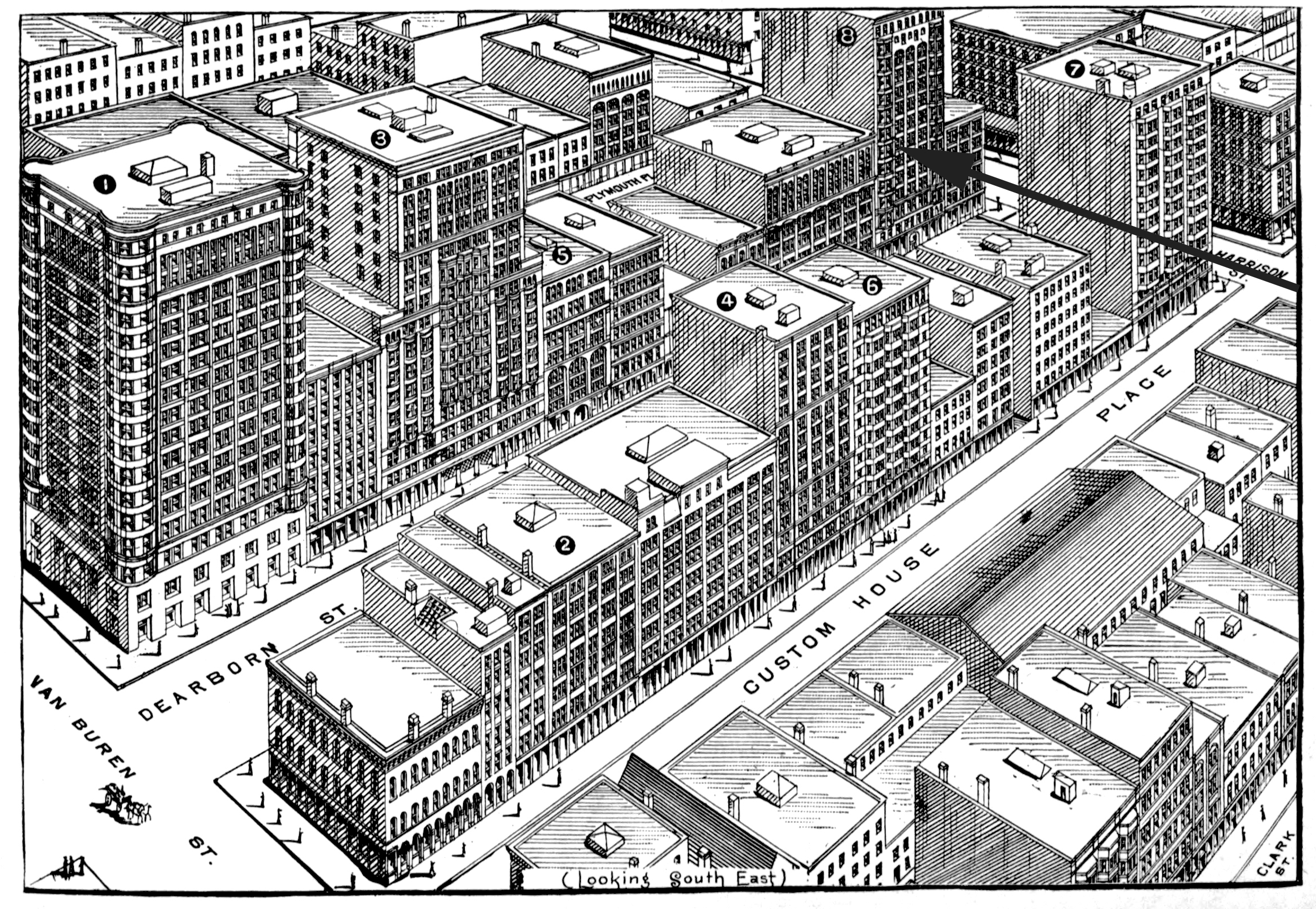 Print (above) portrays faithfully the extraordinary double row of high buildings which lines Dearborn Street between Van Buren and Harrison streets. This is Printing-house Row so called from the large number of printing-offices included within its limits. Among the high structures of this group, described elsewhere, are the ① Old Colony, the ② Girard, the ③ Manhattan, the ④ Monon, the ⑤ Como, the ⑥ Caxton, the ⑦ Pontiac, and the ⑧ Ellsworth.