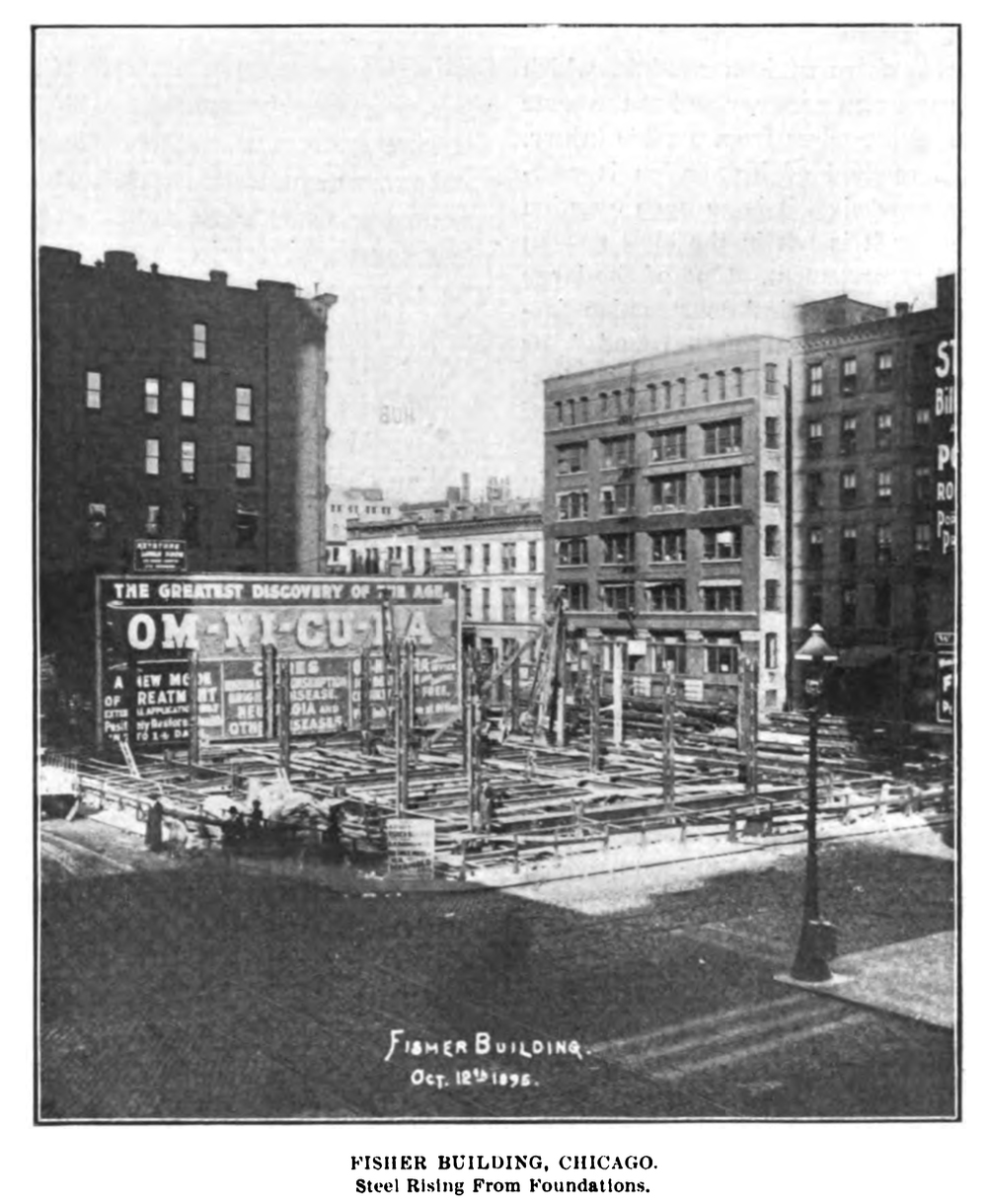 The Fisher building in Chicago, at the time of its completion seven years ago, was a record breaking construction, not only in point of time and the rapidity with which the work was carried through, but more particularly in the new and normal methods followed in the use and application of the steel and its encasement, tested fireproofing.
