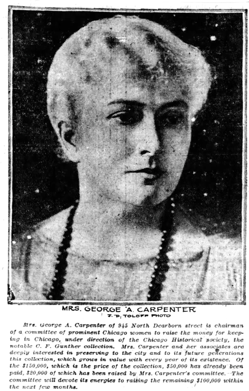 In order to make permanent in the Chicago Historical society the Gunther collection, which is one of the most valuable historical collections in the country, a committee of women, under chairmanship of Mrs. George A. Carpenter, has undertaken to raise $120,000 to complete payment for it. Of this amount, $20,000 has already been raised within a short time. In the fall the items of the collection, all of them of great interest, will be. exhibited in groups, as it will be impossible on account of its size, to show it all at once.