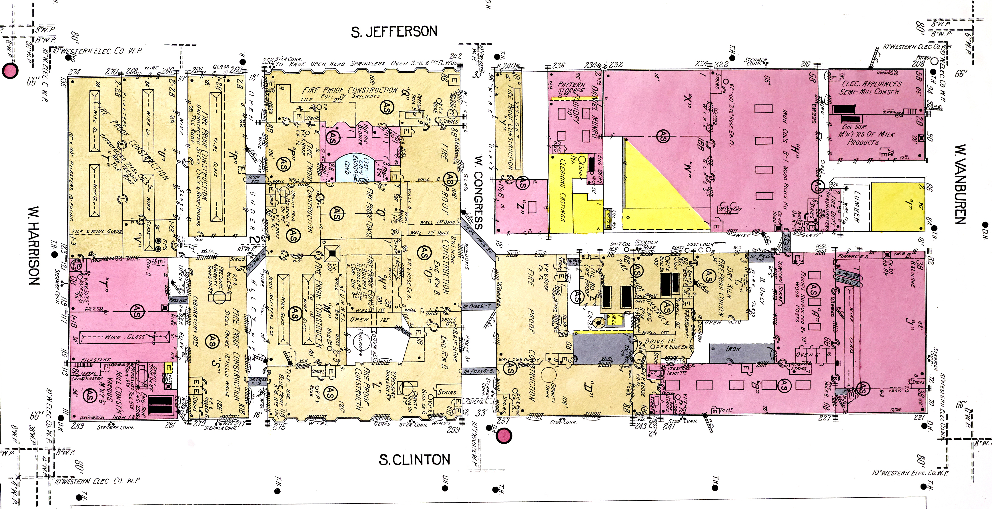 There is no single exception to the rule; floors, columns, partitions, girders , lintels, roofs, brick walls, sheet iron doors, metal window frames and sash with wire-glass, are in evidence at every turn.