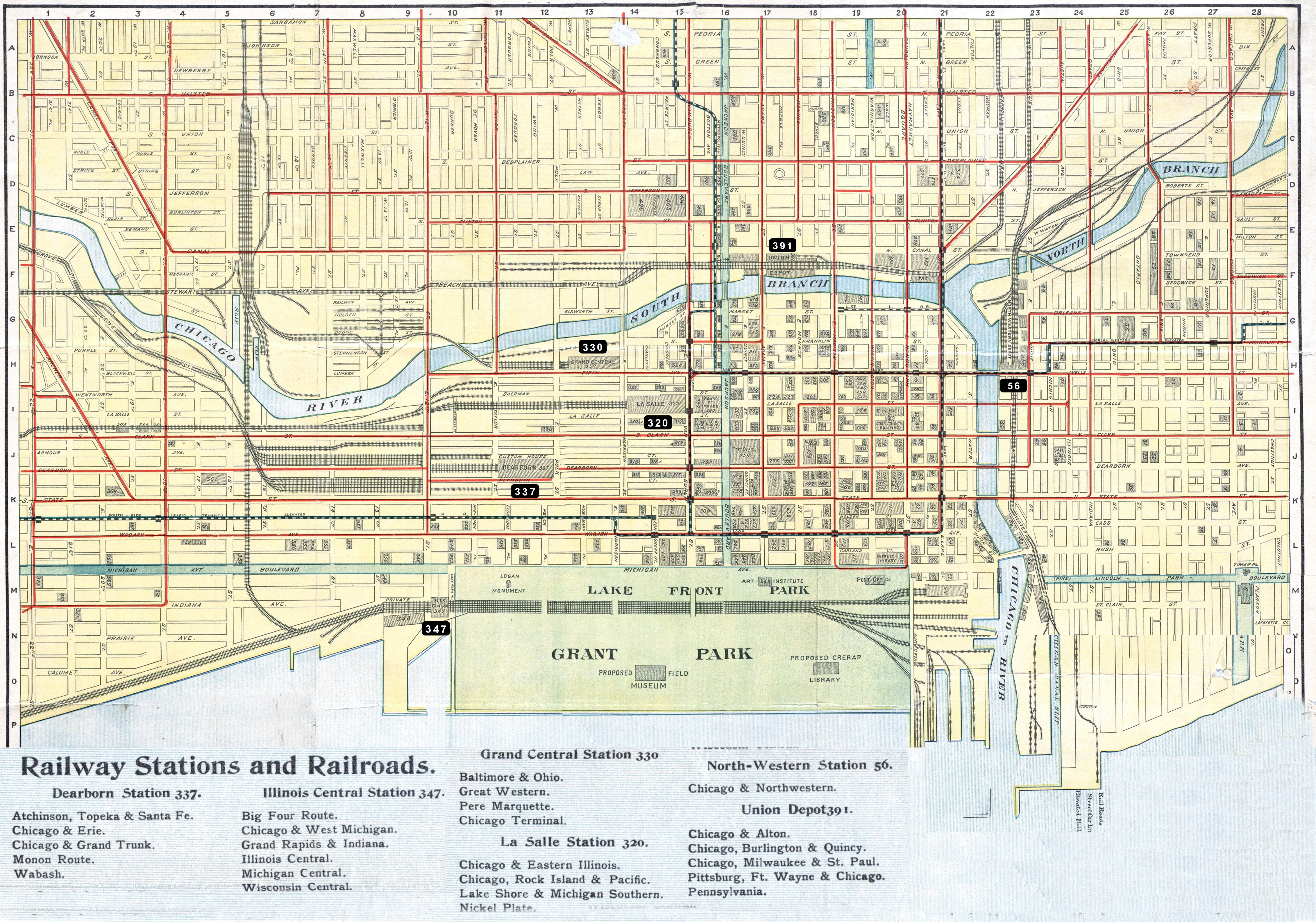 Railway Lines and Depots.—The facilities for transit afforded by the various railway lines centering in Chicago are complete and admirable. The following lines care for the suburban traffic.