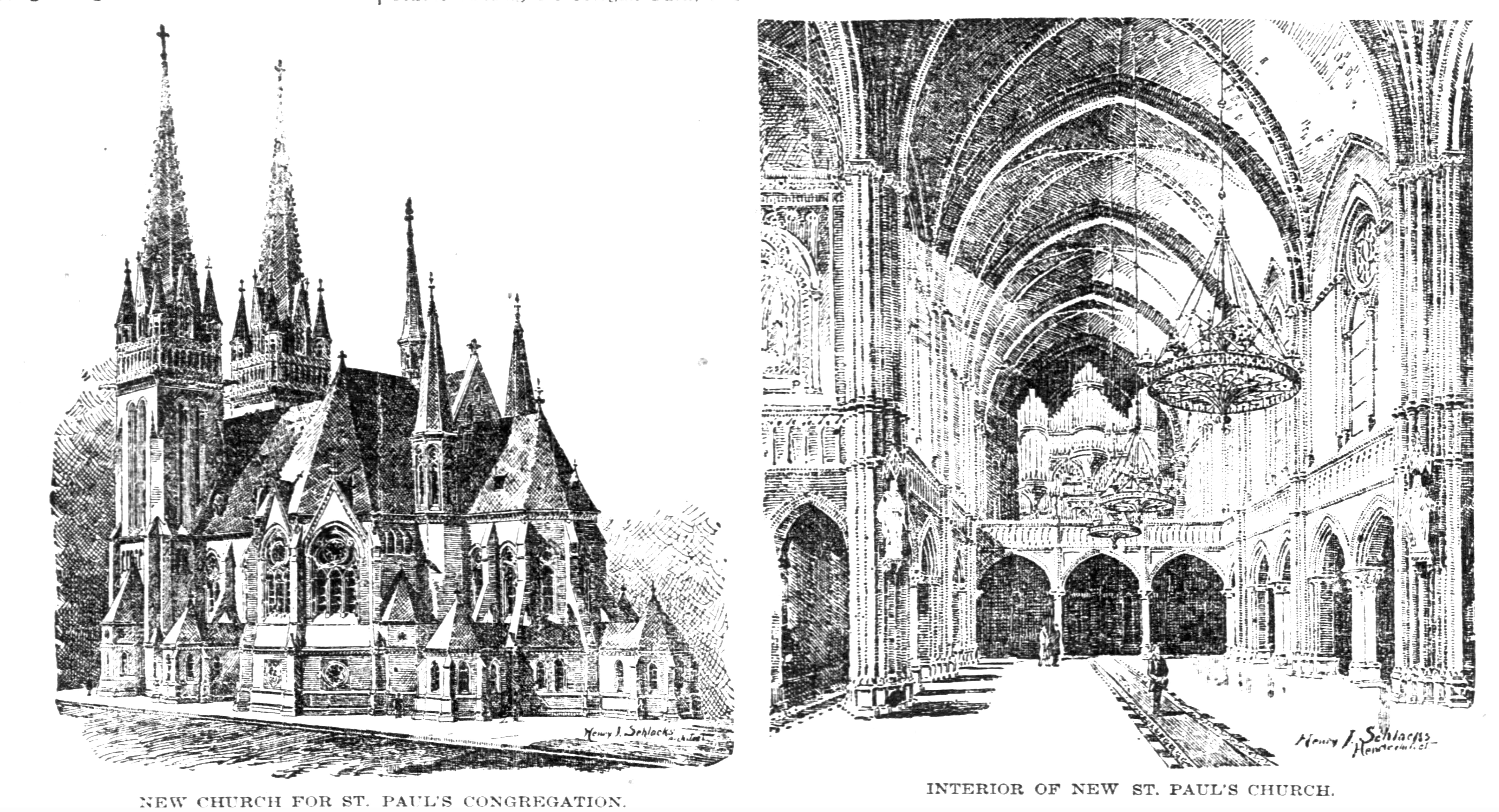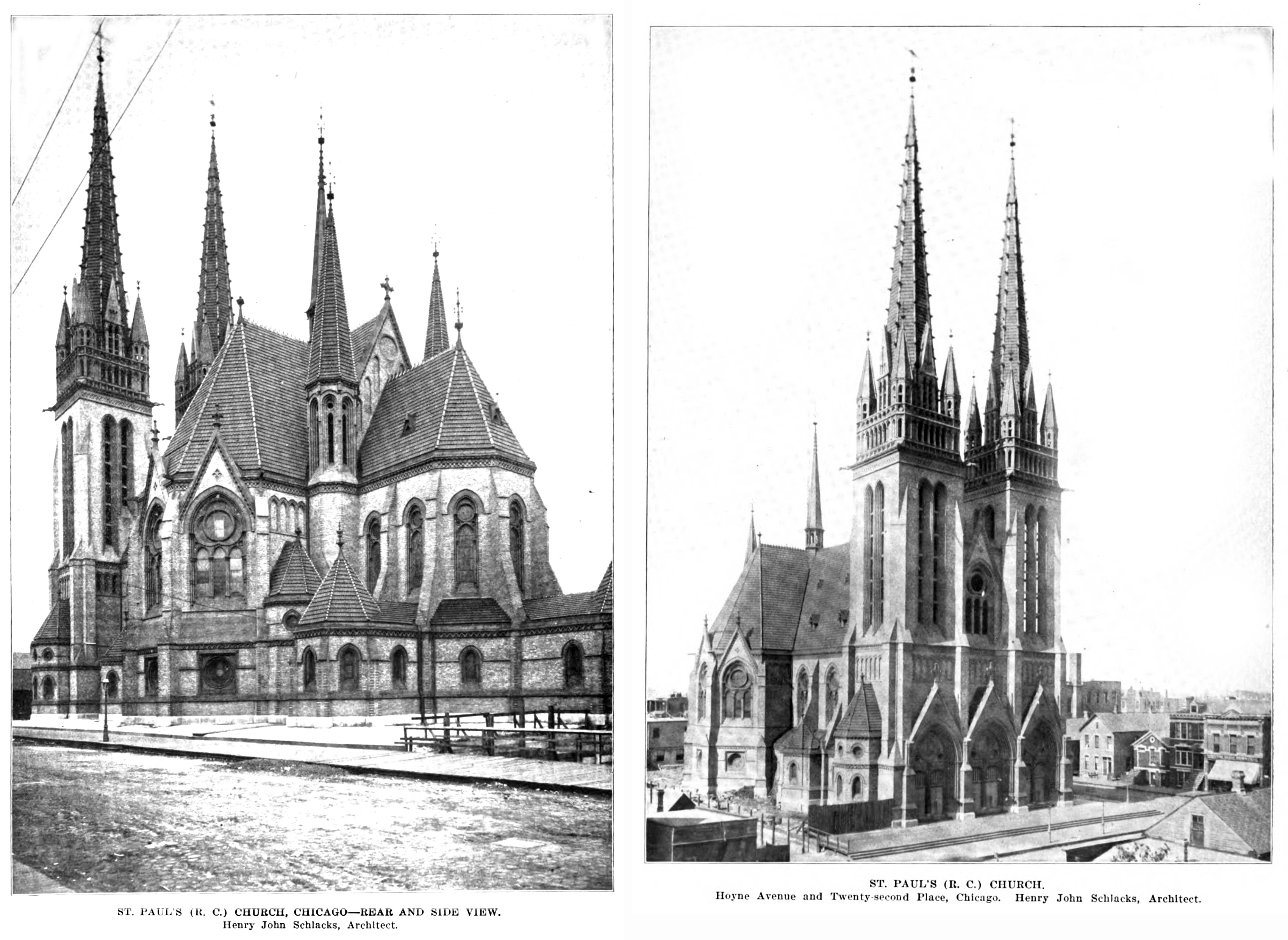 The new St. Paul’s church, in course of construction at Hope avenue and West Twenty-Second place, was designed by Henry J. Schlacks of Chicago, in the style of late Romanesque and gothic, as taken from the twelfth to the fifteenth centuries. The dimensions are as follows: Two hundred and nine feet is the total length, including the sacristy. The width over all is 108 feet. The two towers are each thirty-two feet square ot the bottom, and 245 feet high above sidewalk. The width of the body of the church is sixty-eight feet.