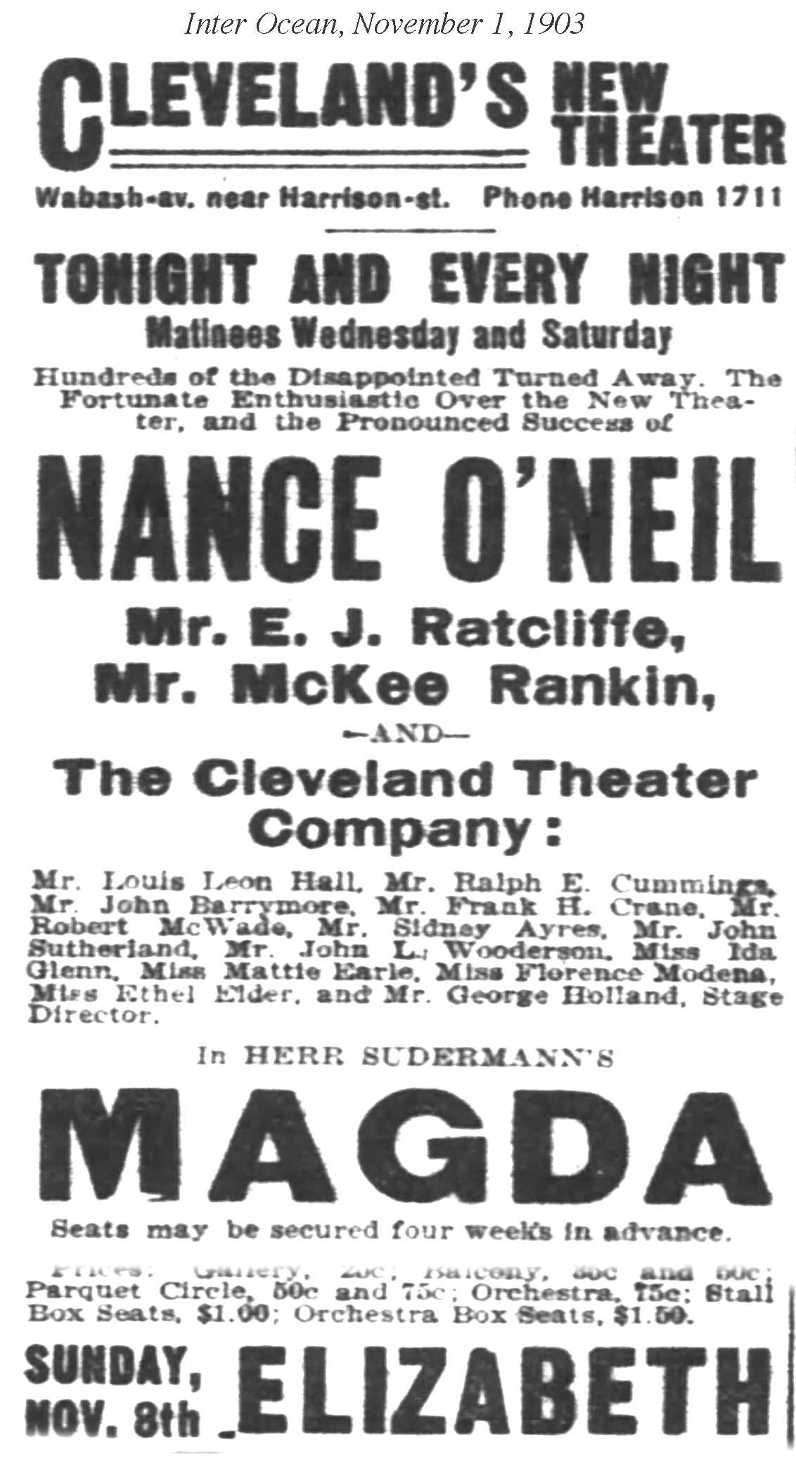 Next Saturday evening will see the adding of a new theater to Chicago’s list of play-houses. The Cleveland is now in sufficient readiness to make possible the announcing of its opening for the last day of the present week. The walls of the old Cyclorama building, at Wabash avenue and Hubbard court, have been used as the inclosing portions of the new place of amusement and within them a theater seating some 1,400 persons has been constructed. The management is authority for the statement that the structure is one of the safest and most perfeet in the country, and the fact that it is open on all sides and has been liberally supplied with exits would certainly seem to assure the safety of the place. Manager W. S. Cleveland has outlined a policy that shall include the presenting of the better class of plays by a stock company and the occasional appearance of stars of prominence. For the opening weeks he has engaged Miss Nance O’ Neil, an emotional actress, who was seen here some seven years ago, and who since that time has made a tour of the world, and has in many places been awarded critical praise as an actress of exceptional gifts. In addition to Miss O’Neil Mr. Cleveland has also engaged for her special support MeKee Rankin and E. J. Ratcliffe, two actors of whose sterling abilities Chicago has had proof on many occasions in the past. These three players are to be the stellar attractions of the house for the next few weeks. The regular stock company which will be employed in their support, and which will offer the regular repertory later on, includes Louis Leon Hall, Ralph E. Cummings, Sydney Ayres, John Sutherland, John Barrymore (son of Maurice Barrymore and brother of Ethel Barrymore), John L. Wooderson, Robert McWade Sr. of “Rip Van Winkle” fame, Frank H. Crane. Miss Ida Glenn, Miss Mattie Earle, Miss Florence Modena, Miss Ethel Elder, and George Holland. For the opening bill Sudermann’s “Magda” has been selected, the title role being regarded by Miss O’Neil’s admirers as one of her best parts.