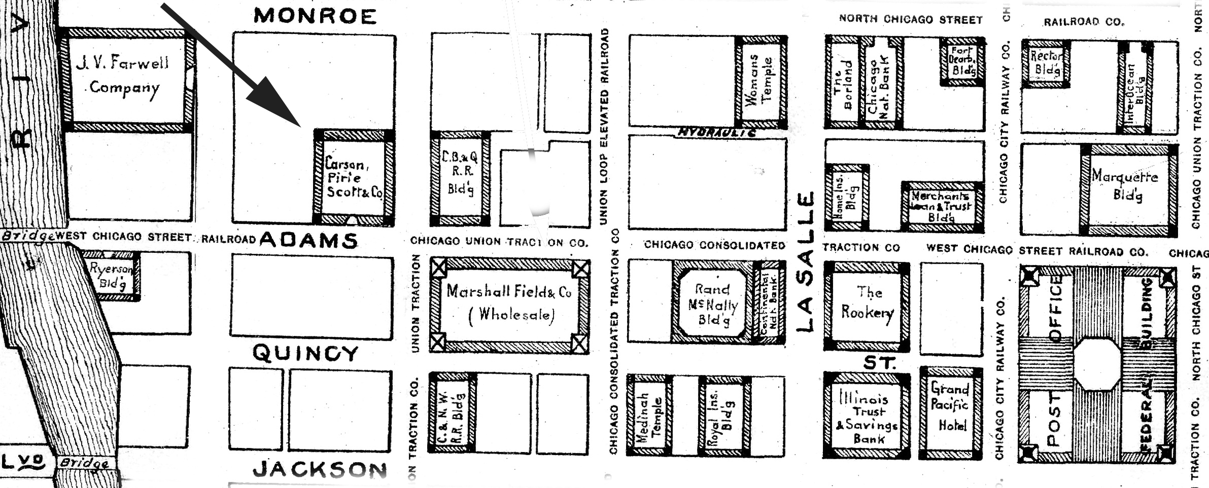 Fronts 160 feet on Franklin Street and 140 feet on Adams Street, at the northwest corner. It is 105 feet high, with 6 stories; cut-stone and iron exterior; occupied by the wholesale dry-goods house of Carson, Pirie, Scott & Co. Erected in 1875.