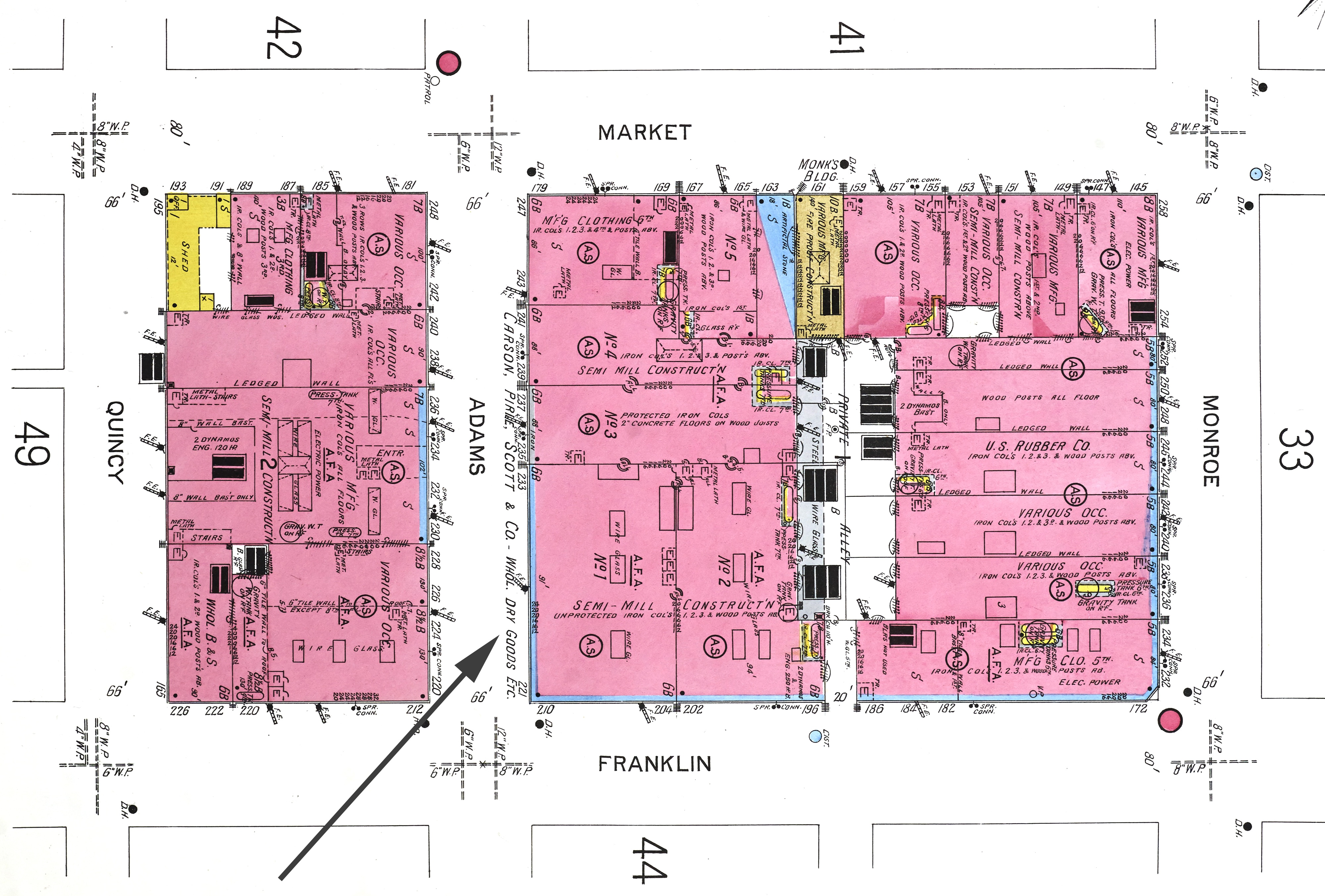 It is rumored that Carson, Pirie, Scott & Co. have arranged to extend their wholesale quarters at the northwest corner of Adams and Franklin streets. This firm now occupies the corner, with a frontage of 140 feet on Adams street and 189 feet on Franklin street, under a ten-years’ lease from the George Armour estate at $55,000 a year. The corner of Monroe and Frankiin streets, just across the alley to the north, is now occupied by Kuppenheimer & Co. It fronts 189 feet on Franklin street and 50 feet on Monroe and is owned by the Hovey estate. The present lease expires next January and Kuppenheimer will remove to the Boddie Building. Carson, Pirie, Scott & Co. have leased this block for a long term and so have secured the entire east front on Franklin street between Adams and Monroe streets.