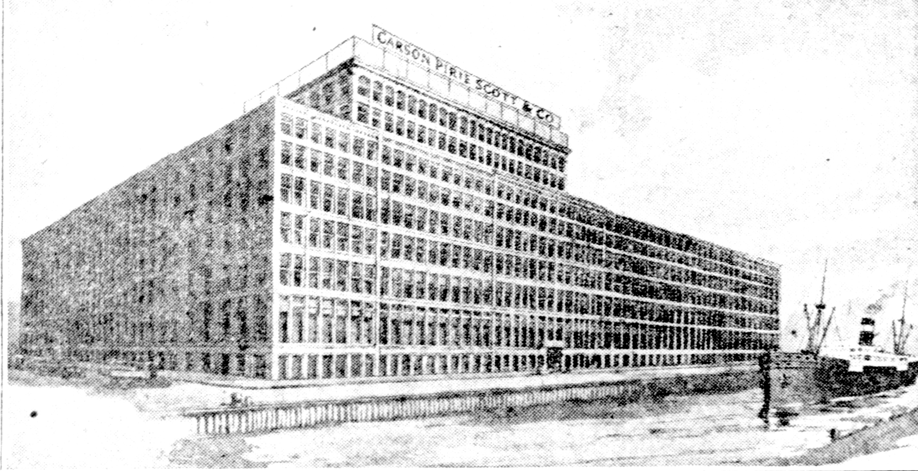 The above picture shows how Carson, Pirie, Scott & Co,’s wholesale building, recently purchased from John F. Farwell & Co., will look when the building within a building told about in these columns on April 25 is completed. The firm is spending more than $1,000,000 on remodeling the structure, the main point of which will be an eight story building erected in the old areaway. When work is finished the building, occupying the block bounded by Adams, Market, and Monroe streets and the Chicago river, will have a floor space of 1,000,000 square fect. The foundation along the river is being dug 100 feet to bedrock. The firm will be able to use the tug and three barges it recently bought to carry goods to and from its 18th street warehouse.