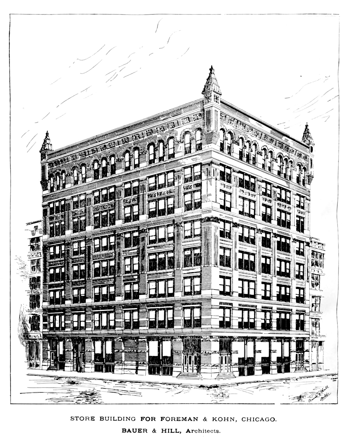 Business block for Henry G. Foreman and Henry A. Kohn, by Bauer & Hill, architects, Chicago. The building is situated on the southwest corner of Adams and Franklin streets, is 100 by 125 feet, eight stories and basement high, a total height of 134 feet from the street level. The materials are St. Louis pressed brick, blue Bedford stone and terra-cotta, slow burning construction. A light court is in the southwest corner, under which is placed the boilers and steam heating apparatus. The building was commenced July 22, 1886, and is under heavy bond to be finished January 1, 1887, which will be done. Cost about $200,000.