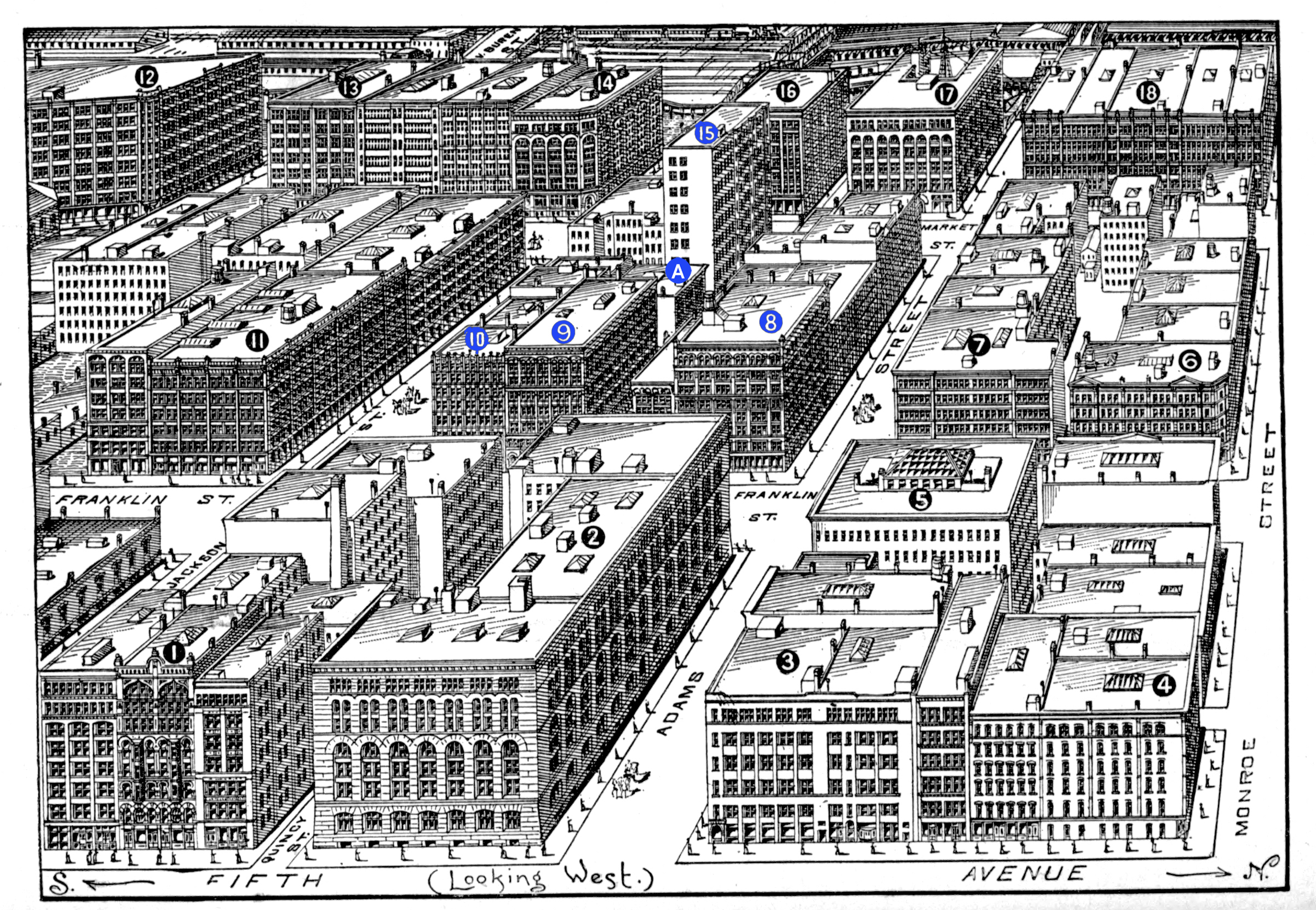 Fronts 180 feet on Fifth Avenue and 100 feet on Monroe Street, at the southwest corner. It is 95 feet high, with 6 stories and basement. There are 3 freight and 2 passenger elevators, brick and cut-stone exterior. The structure is occupied by wholesale jobbers of clothing and woolen goods. Erected in 1874.