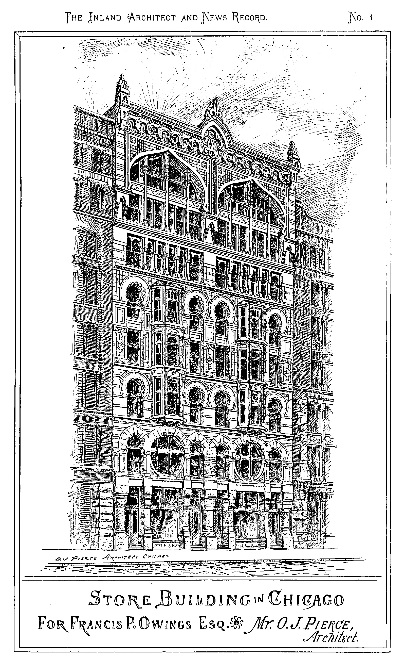 O. J. Pierce, architect. This building occupies an area of 64 feet front by 88 feet deep, and is eight stories in height above cellar. It is divided into two distinct buildings, by a heavy wall, from foundations to coping above roof, and the stores and floors above are entirely unobstructed by columns. Two freight and one passenger elevator, fireproof vaults, steam heating, etc., complete. The front is of marble, stone and iron, and the Saracenic design marks something of an innovation in Chicago street architecture. The cost was about $80,000.