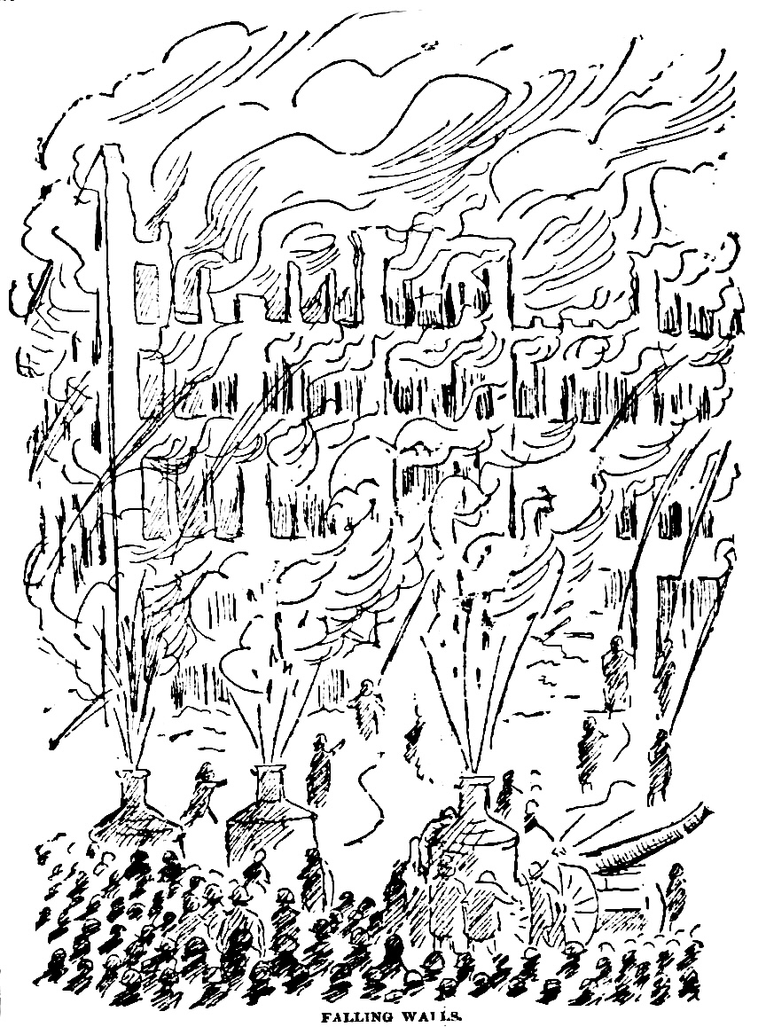 No more wall had fallen at this time, but there was still a great deal of fire within the building which half a dozen streams were wetting down. All the floors had fallen through with the exception of a small portion at the rear, where the timbers still furnish slight support to a small section of it. The origin of the fire is a mystery.