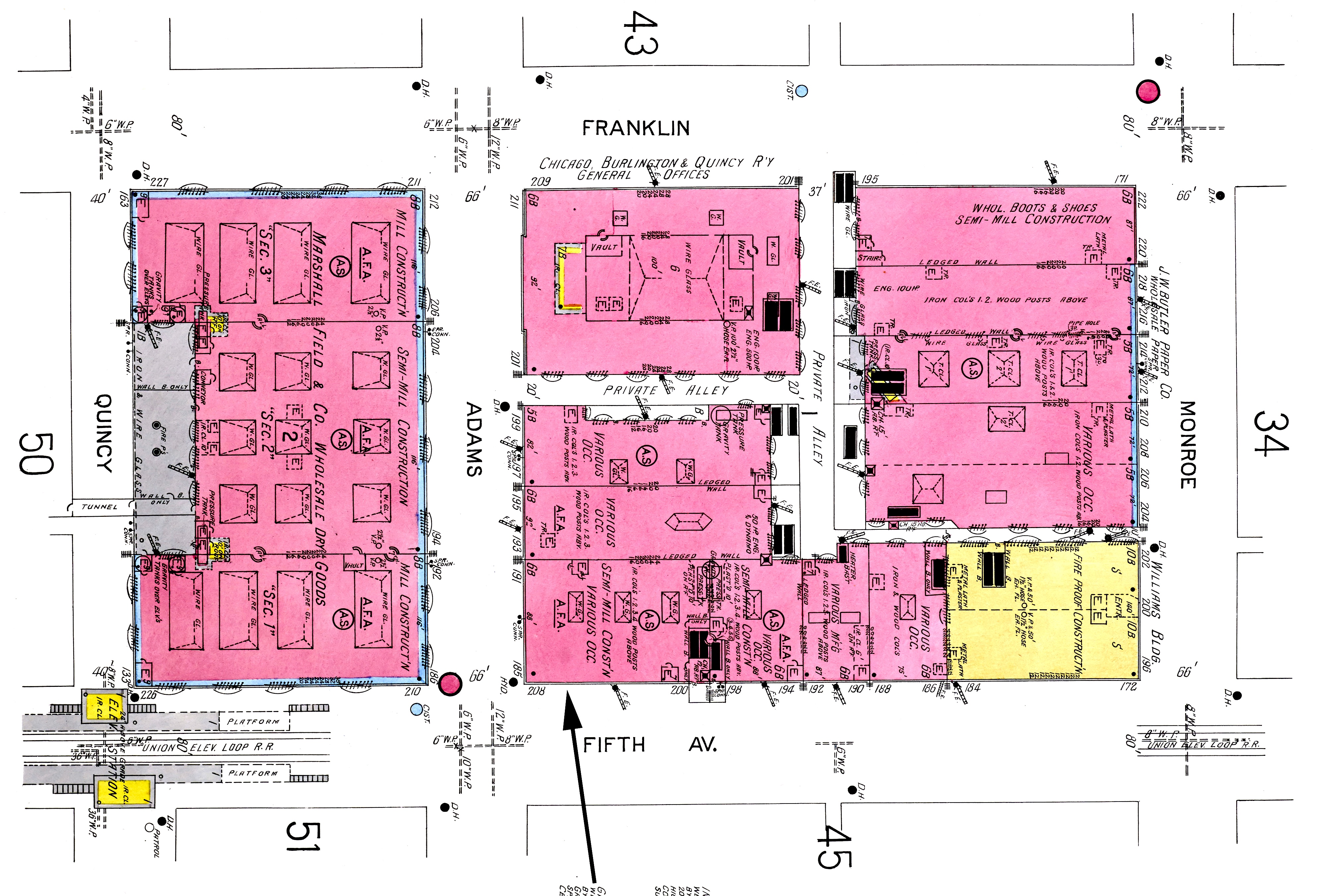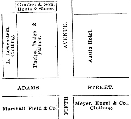 Fronts 80 feet on Adams Street and 180 feet on Fifth Avenue, at the northwest corner. It is 95 feet high, with 6 stories and basement; pressed-brick and terra-cotta exterior; 2 passenger elevators and 3 freight elevators. It is occupied by Phelps, Dodge & Palmer, wholesale jobbers and manufacturers of boots and shoes, and by wholesale jobbers of clothing. Erected in 1888 after a destructive fire.