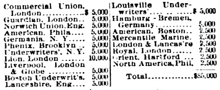 The Mutual of New York is said to have fully $30,000 upon the property. The loss will be distributed among over 100 companies, whose individual losses range from $1,000 to $30,000.