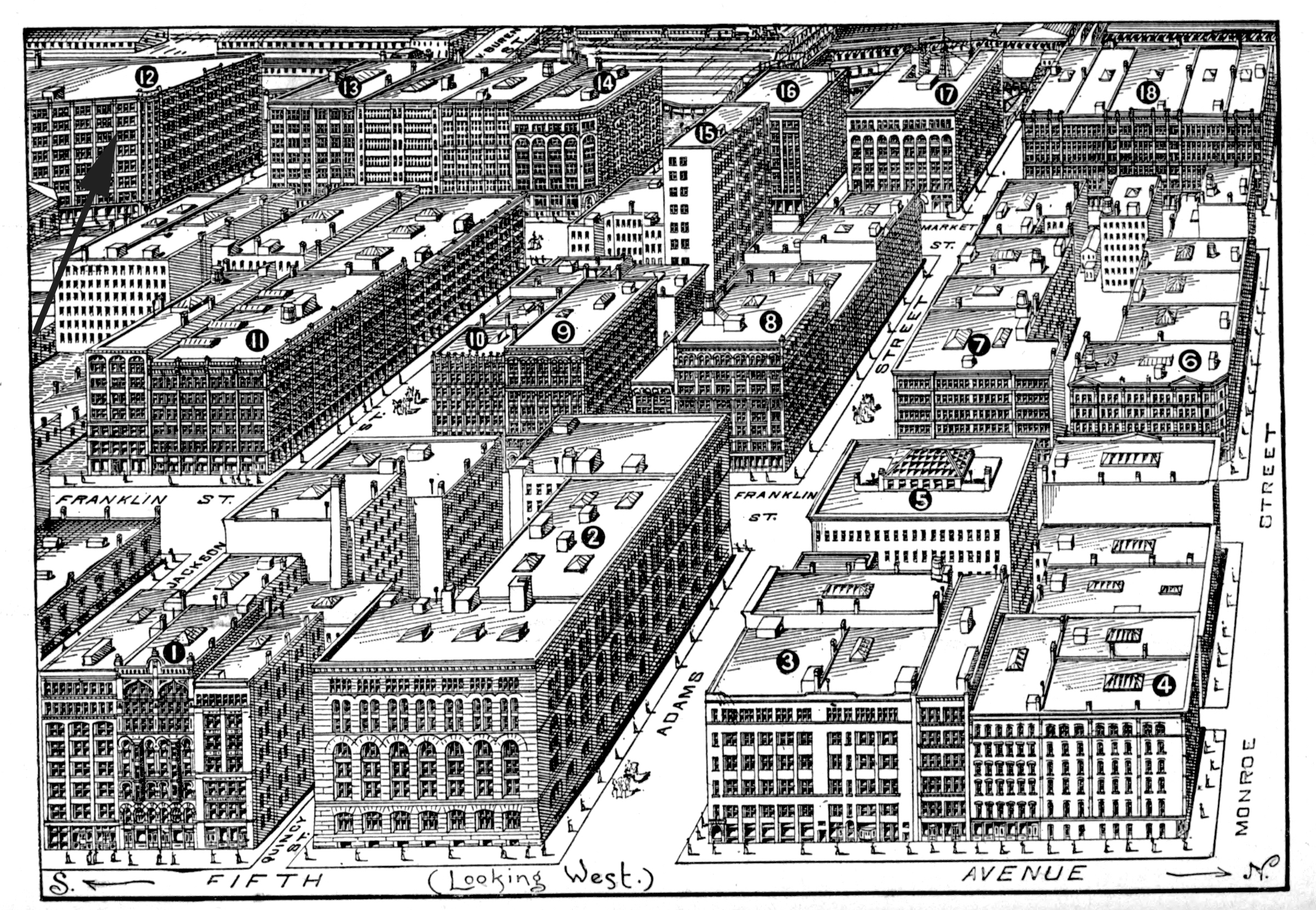 This very conspicuous structure appears across the head of Market Street at Van Buren Street, because of the eastern division of the river. The building fronts 160 feet on Market Street and 95 feet on Van Buren Street, at the southwest corner. It is 100 feet high with 8 stories, and the walls are of cut-stone, brick, and terra-cotta. There are 2 freight and 1 passenger elevators. The occupants are wholesale jobbers and manufacturers of clothing. Erected in 1887.