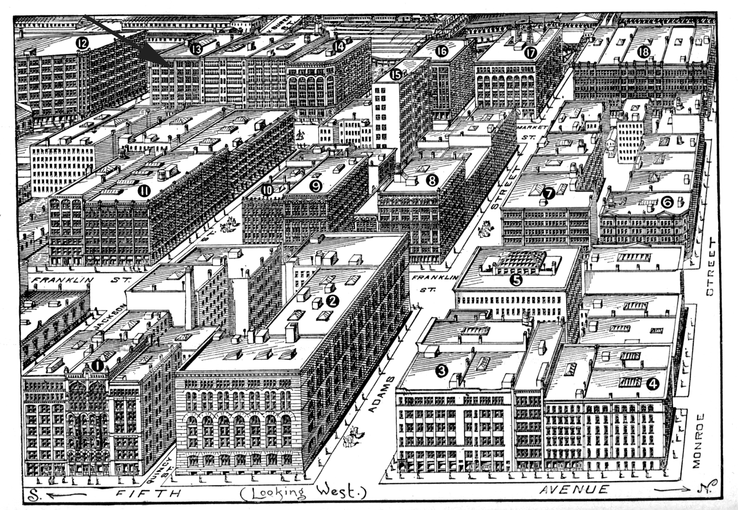 Fronts 75 feet on Van Buren Street and 50 feet on Market Street, at the northwest corner. It is 90 feet high, with 7 stories; cut-stone and brick exterior; 2 freight elevators, 1 passenger elevator. Occupied by wholesale jobbers of clothing. Erected in 1889.