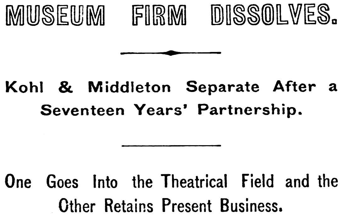 After operating museums in Chicago and a number of other cities for seventeen years the partnership of Kohl & Middleton was dissolved yesterday. Mr. Kohl will continue in the theatrical business, with Messrs. Castle and Hopkins as his business partners. Mr. Middieton is now the sole owner of the Clark street dime museum. He says he may start a syndicate and operate museums in Europe, but will continue his show in this city.