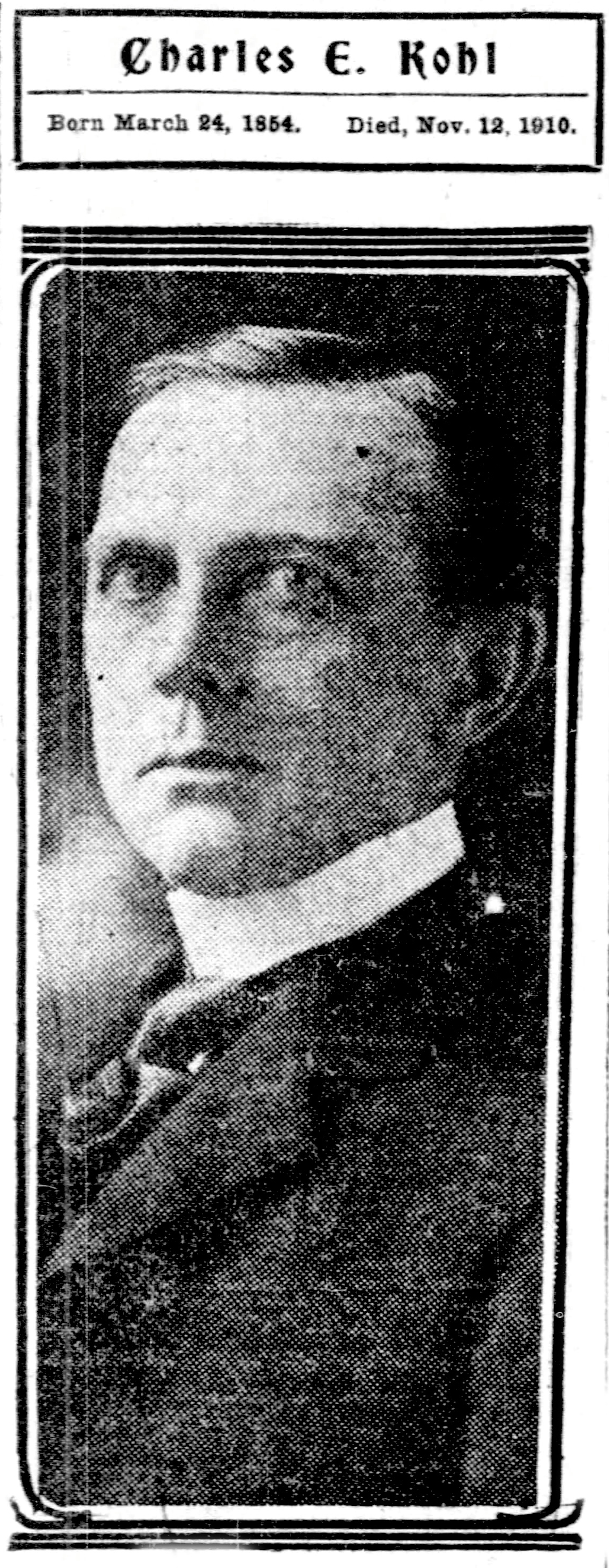 Caroline and Dorothy, were traveling in Europe. Upon their return they remained only a short time at the family residence, 2826 Michigan avenue, and then went to Oconomnowoc to urge Mr. Kohl to go to California for the winter. They reached there on Thursday. The only member of the family remaining in Chicago was Charles E. Kohl, the elder son, and a telegram called him to join the others early in the morning. The funeral will take place at 2:30 tomorrow afternoon.