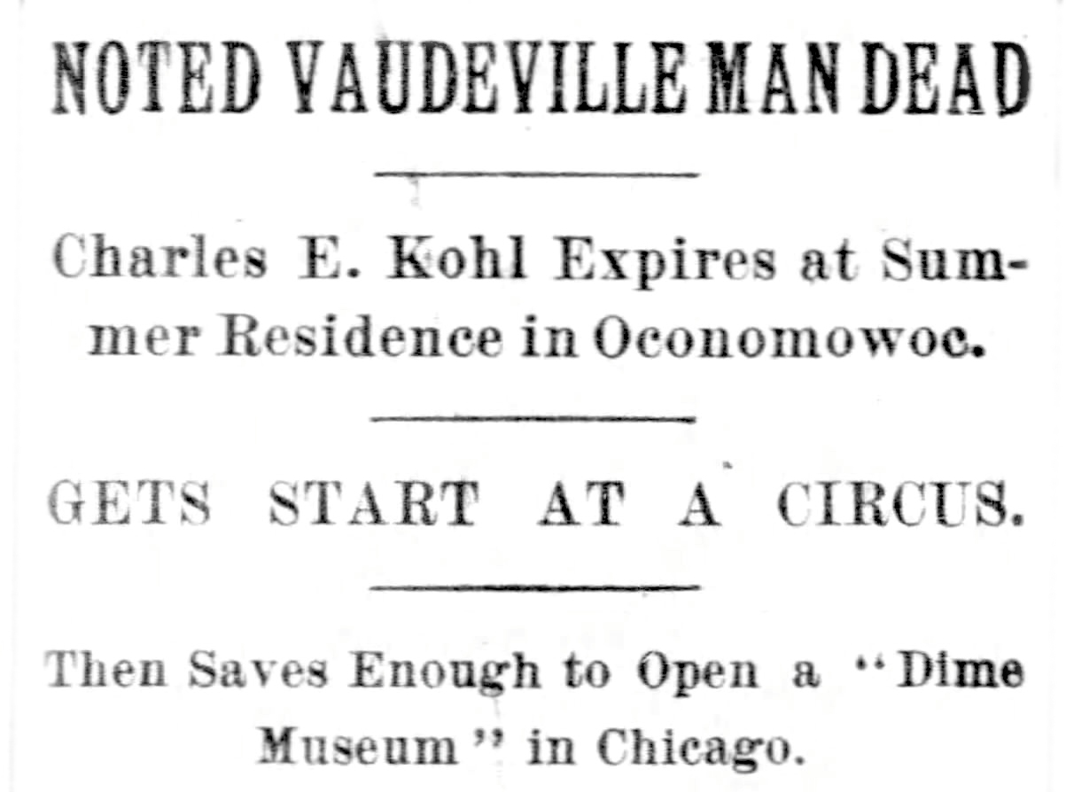 Charles E. Kohl, one of the most conspicuous figures in American vaudeville management, and one of the men accredited with raising that form of entertainment to its present plane, died at his summer residence in Oconomowoc, Wis., yesterday morning.