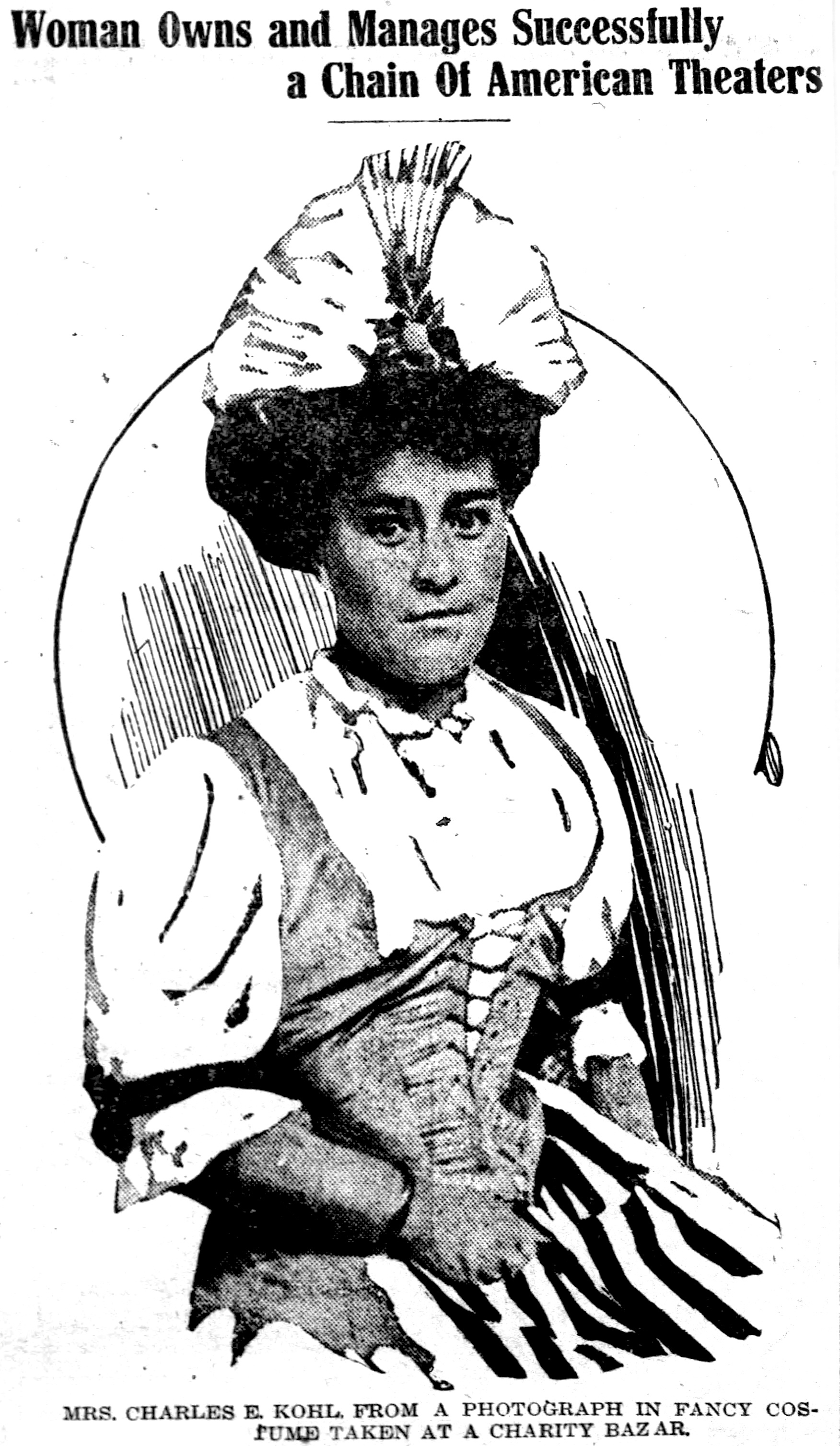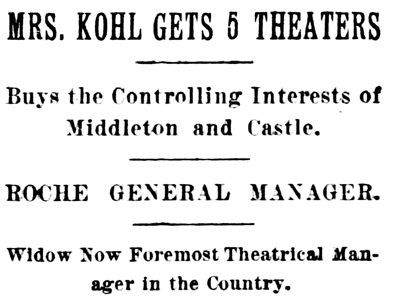 In August last Mrs. Kohl purchased the holdings of George Middleton and George Castle, her husband’s partners. She placed the name of Kohl at the head of Chicago theatricals and became the leading woman theatrical manager in the country, which, no doubt, means in the world.