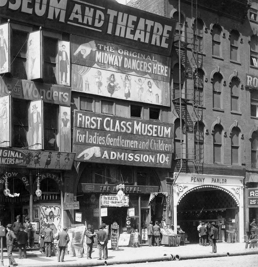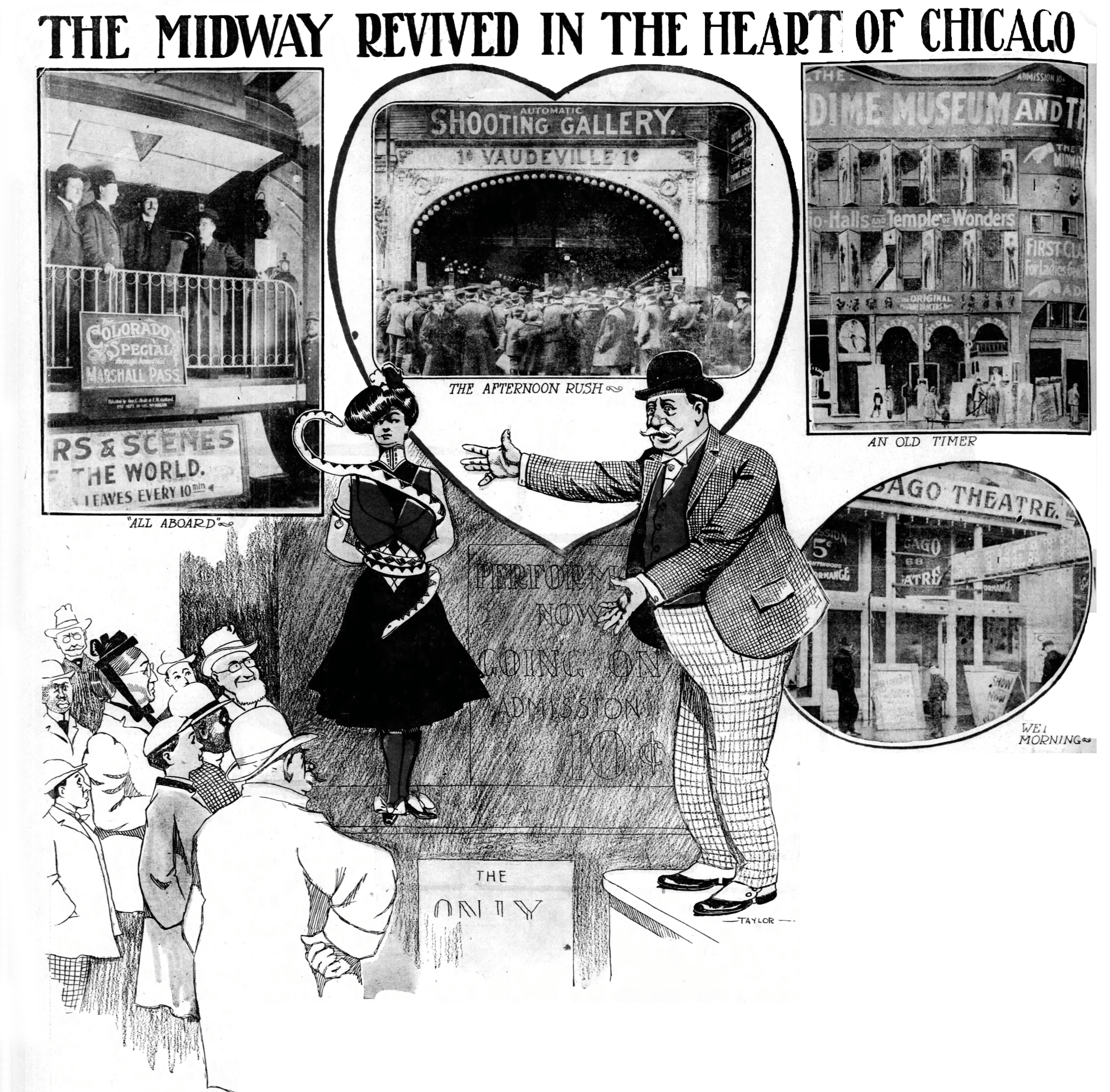 Barnumized and still Barnumizing, this Columbian Midway has moved upon the old levee resorts which once made Harrison street the dividing line between the upper and the nether worlds until its barking barkers, its penny arcades, its 5 cent theaters, its lights and sounds and frivolities have made another Coney island in a sea of city night.