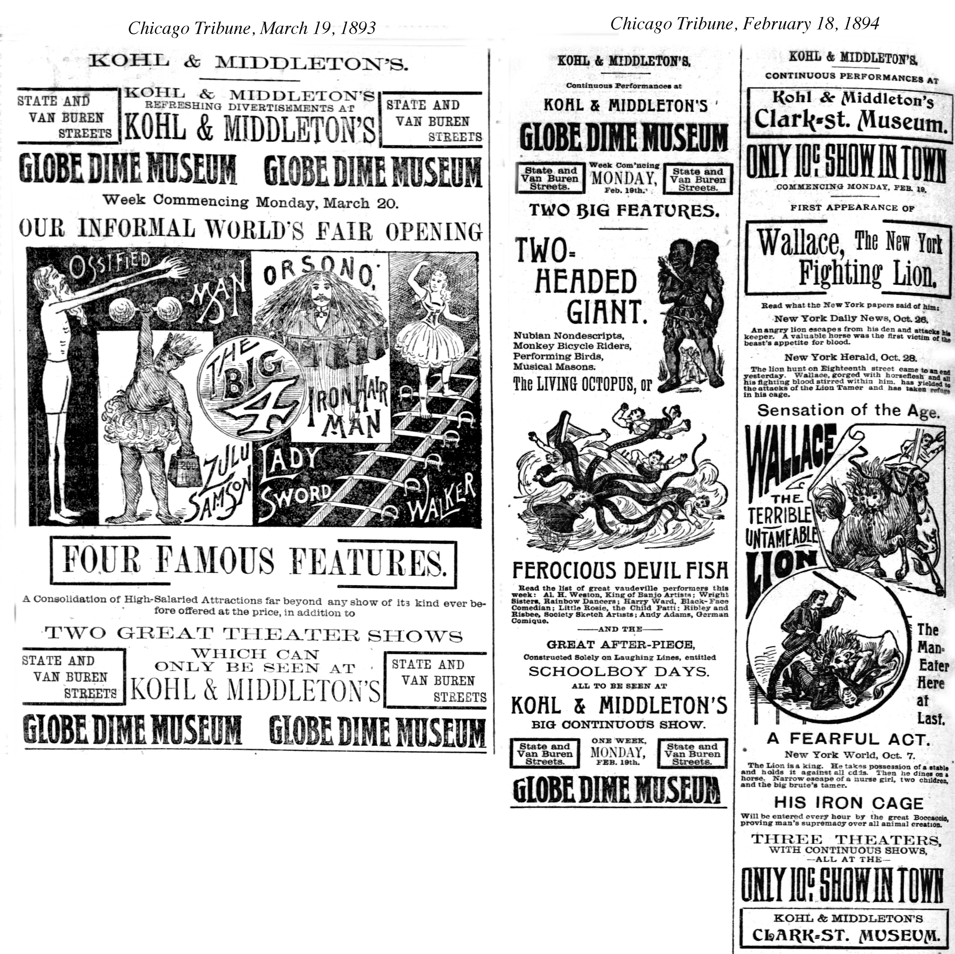 Kohl & Middleton’s South Side Museum.—located at 146, 148, 150 and 152 South Clark St., near Madison. Kohl & Middleton, proprietors. This is what is popularly known as a dime museum. Stage performances are given almost hourly through the day. A visit to the place will reveal a curious collection of freaks, etc. Admission, 10 cents.