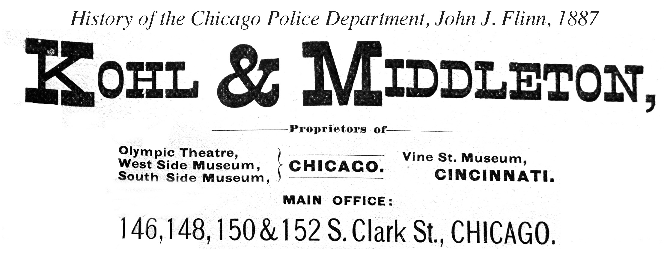 Kohl & Middleton (Charles E. Kohl and George Middleton) museums 150 Clarks and 292 State and props. Olympic Theatre 51 Clark