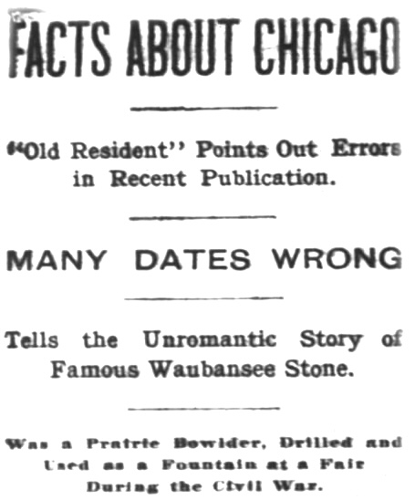 To begin with, the Waubansee stone, which stands In a private yard at No. 100 Lincoln park boulevard, has a rather interesting his-tory, but not a romantle one, by any means. It was not carved by a soldier at Port Dearborn in 1812, nor did Daniel Webster use it for a platform from which to prophesy the future greatness of the Garden City. The facts about the Waubansee stone are these: