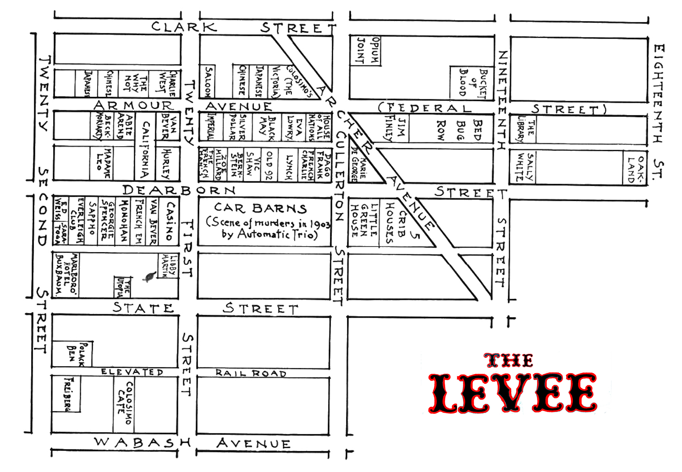The old levee extended as far west as Sherman avenue, but almost all of this territory up to the river is now controlled by the railroads, so that the western end of the levee has been forced as far east as Clark street. On Clark street the levee extends as far north as Van Buren, though business blocks are to be seen here and there; on Custom-House place it stops between Harrison and Van Buren streets; on Plymouth place most of the property has been improved for legitimate business enterprises as far south as Harrison street and even beyond. It is difficult to say, how much of State street is in the levee and how much has been annexed to the mercantile district.