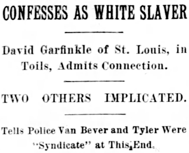 David Garfinkle, St. Louts saloon keeper, the agent in in that city of the Van Bevers, was fined $300 and sentenced to six months in the Workhouse. He sold Frankie Davis, 19 years old, to the Van Bevers. Motions for new trials were denied all the defendants.
