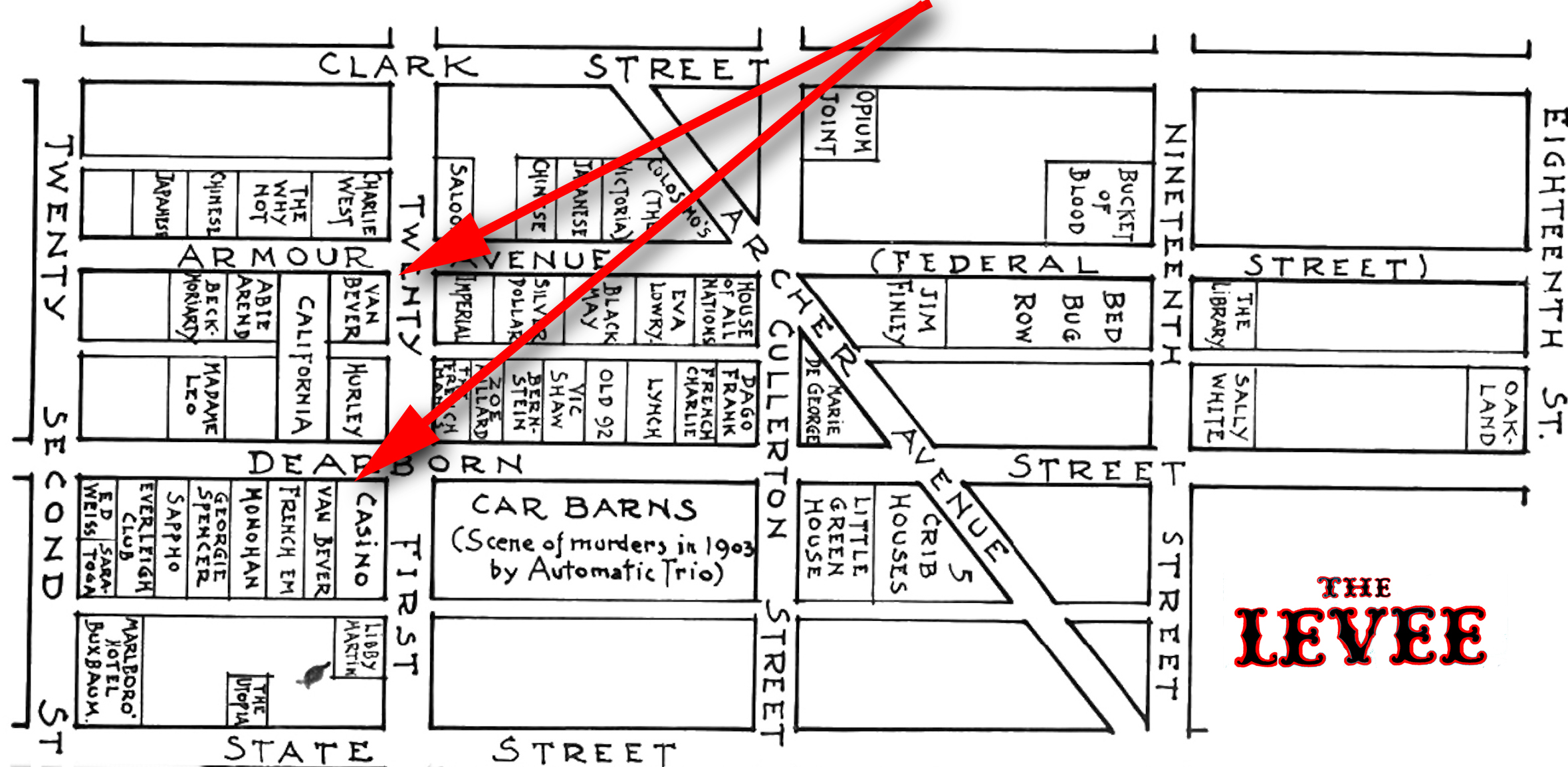 Simplified version of the map featured in the Chicago Tribune, January 26, 1936 story on the Everleigh Sisters. Published in “Gem of the Prairie” by Herbert Asbury, 1940