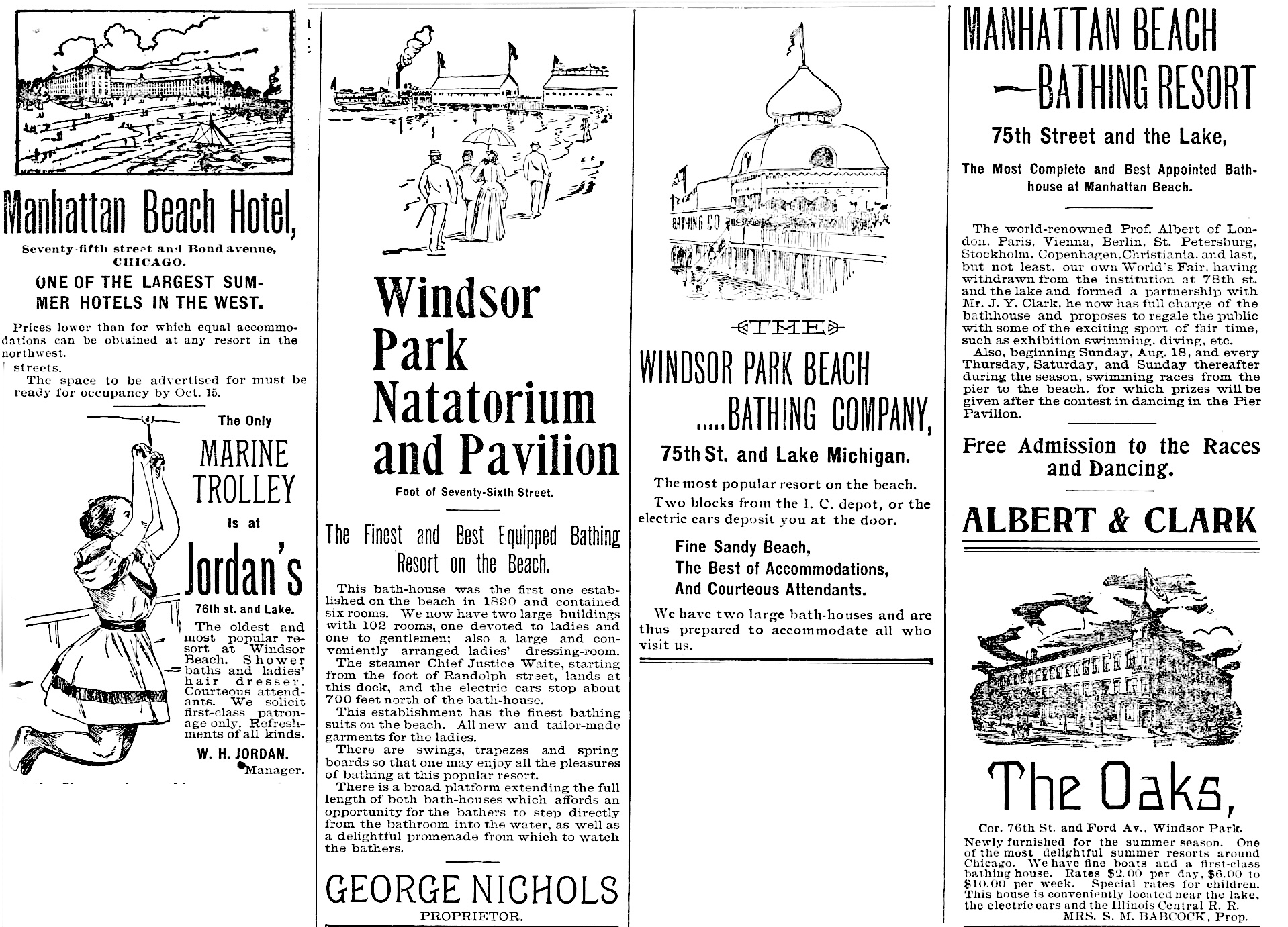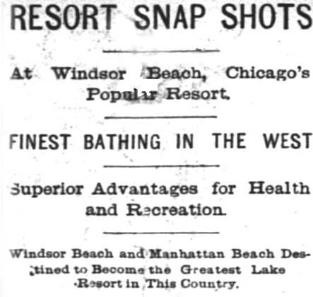 The proprietor of the Windsor Beach Toboggan Company is Jordan, an early comer to the beach. He has a stock of interesting details of resort life that would make a funny book. He is ingenious in devising means of enjoyment for his patrons and has a very popular bathing spot. One of his introductions is a shower bath for ladies and gentlemen, which may be used both before and after a plunge into the lake. He also has something original in suits for bathers that goes to make his place patronized. In connection with the bathing pavilion he runs a restaurant and refreshment stand. The business is on the increase, and be is very enthusiastic over the future success of Manhattan and Windsor Beach as a resort.