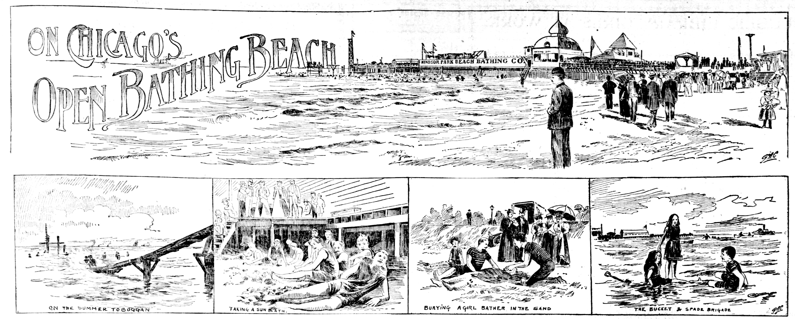 It is Chicago’s only open-air bathing resort where large numbers can be accommodated, and the thousands who do not leave town for the season appreciate that fact, While there are amusements and games without number it is the swimmers bobbing up and down in the water that form the center of attraction. The lake at times is fairly alive with the bathers in every variety of bathing suits dyed in every shade of gorgeousness. The bathers splash water on each other with childish glee and boys of ten and men of forty vie with each other in feats of swimming, diving, and riding rafts. At one place on the beach is a toboggan slide where the more daring can “shoot the chutes” without fear of getting wet, for that is the grand object of all these sports and the more complete the ducking the more popular the sport. Two or three sit on a toboggan, and pushing off whirl down the incline, and striking up a cloud of spray skim along the surface of the water for a few feet and then sink like a stone. Then there’s a trolley wire stretching from a high platform to a post driven out in the lake. The bather grasps the trolley with both hands and after attracting enough of an audience to insure plenty of oh’s and ah’s launches off, whizzes down the wire, and concludes the “wild flight through space” by dropping into the water just before the end of the wire is reached.