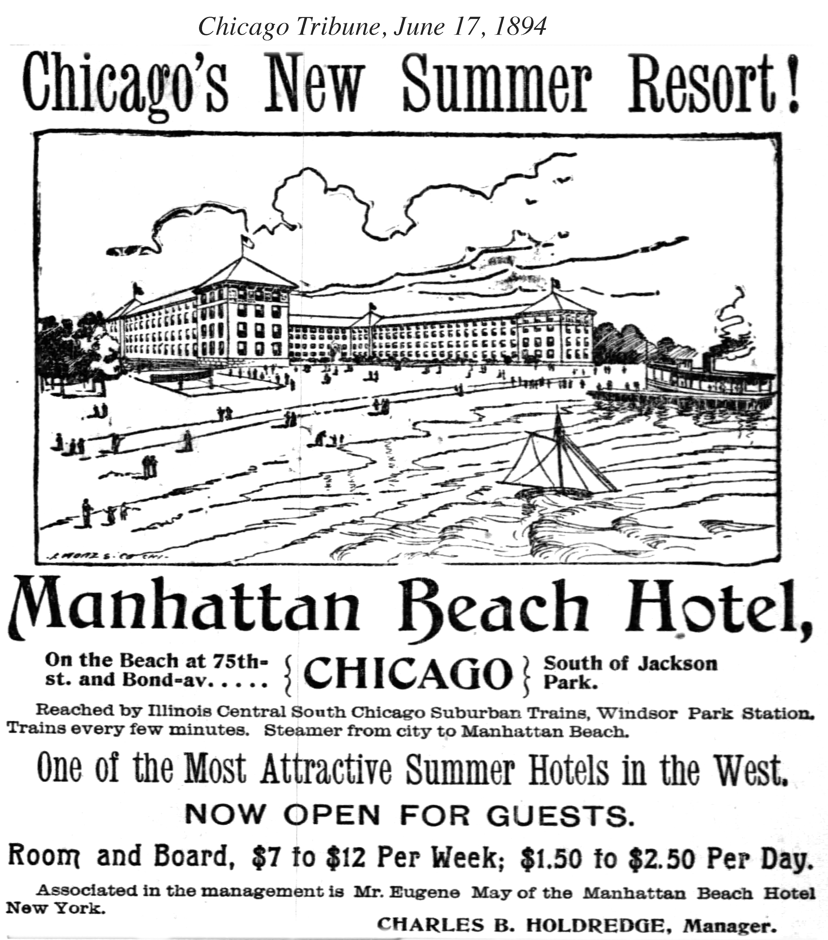 The average business man in Chieago has very little time for recreation. The drive of the business world keeps him at his store, office, of factory from morning till night, year in and year out, and evenings and Sundays are bis only days of pleasure seeking. There are those who break away from business cares and seek the salubrious climes of the summer resorts for a few weeks during the hot months, but this class even frequently do so at a great detriment to their commercial interests. Such conditions are bringing into requisition the manifold natural advantages of the resort features adjacent to Chicago, and as a result Windsor Beach is this season enjoying more liberal patronage and the facilities for bathing are being increased in a most elaborate style. Windsor Beach and Manhattan Beach may well be termed the Coney Island of Chicago. Here within a few minutes’ ride by the Illinois Central, South Side Elevated Road, and electric lines the dust and condensed heat of the downtown districts may be left and the soothing. health-giving breeze from Lake Michigan, with all the attractions of the seaside secured, and at a nominal expense. There are hotels for those who desire to live there for a period where the busy man may take his family, attend to business in the city during the day, and recuperate his lost energy at night, enjoying the resort advantages. A large number of very conveniently arranged and properly conducted pavilions have been erected, and there are clam bakes, water toboggans, merry-go-rounds, trolleys, In fact all the amusement inducements to be found at pleasure points through the country. The nucleus of Manhattan Beach is the Manhattan Beach Hotel.